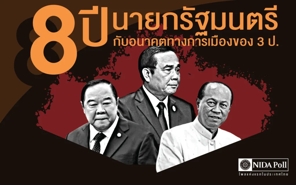 ศูนย์สำรวจความคิดเห็น นิด้าโพล สถาบันบัณฑิตพัฒนบริหารศาสตร์ (นิด้า) เปิดเผยผลสำรวจของประชาชน เรื่อง 8 ปี นายกรัฐมนตรีกับอนาคตทางการเมืองของ 3 ป. ทำการสำรวจระหว่างวันที่ 2-4 สิงหาคม 2565 จากประชาชนที่มีอายุ 18 ปีขึ้นไป กระจายทุกภูมิภาค ระดับการศึกษา อาชีพ และรายได้ ทั่วประเทศ รวมทั้งสิ้น จำนวน 1,312 หน่วยตัวอย่าง เกี่ยวกับวาระการดำรงตำแหน่งนายกรัฐมนตรีไม่เกิน 8 ปี กับอนาคตทางการเมืองของ 3 ป. การสำรวจอาศัยการสุ่มตัวอย่างโดยใช้ความน่าจะเป็นจากบัญชีรายชื่อฐานข้อมูลตัวอย่างหลัก (Master Sample) ของ นิด้าโพล สุ่มตัวอย่างด้วยวิธีแบบง่าย (Simple Random Sampling) เก็บข้อมูลด้วยวิธีการสัมภาษณ์ทางโทรศัพท์ โดยกำหนดค่าความเชื่อมั่น ร้อยละ 97.0
