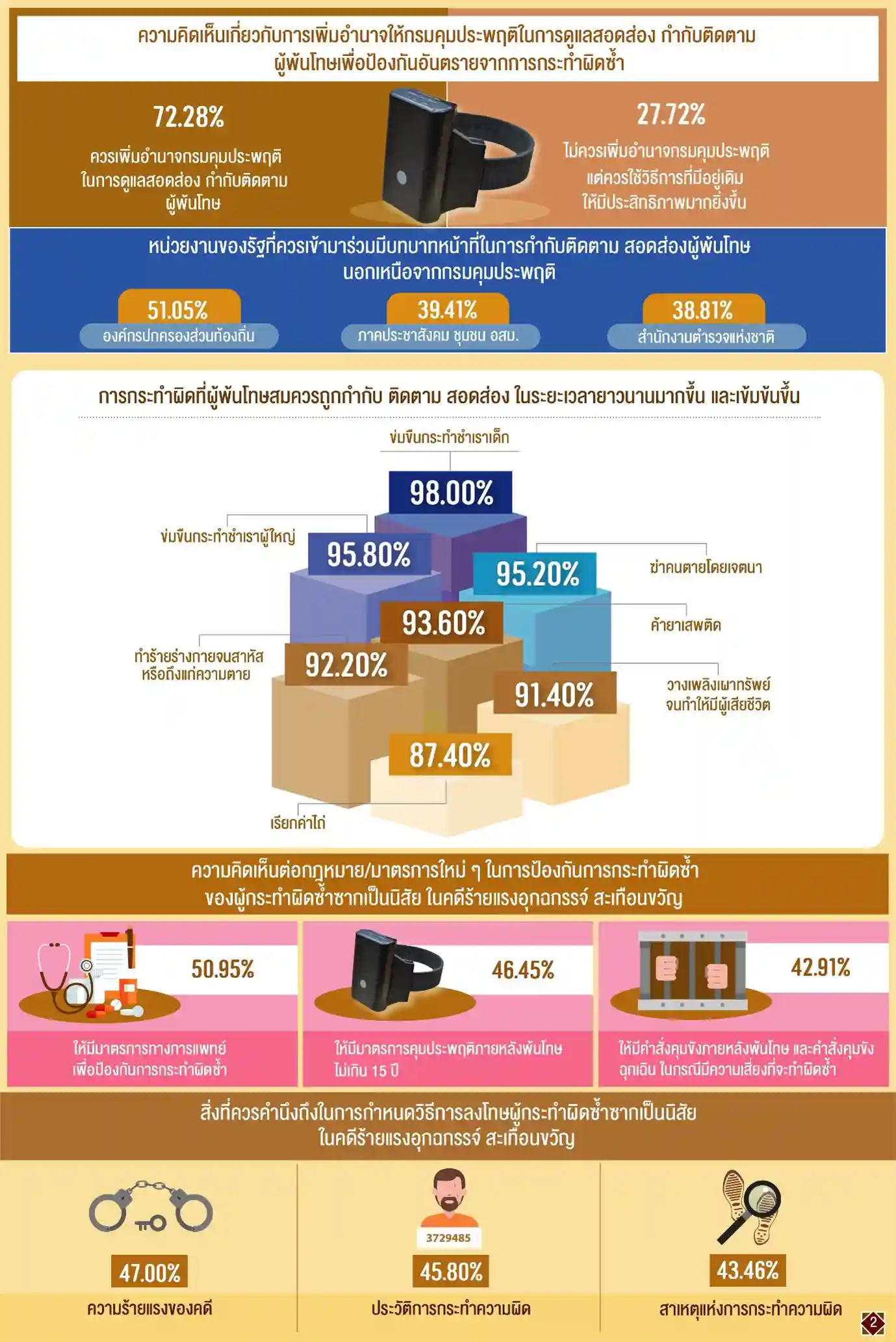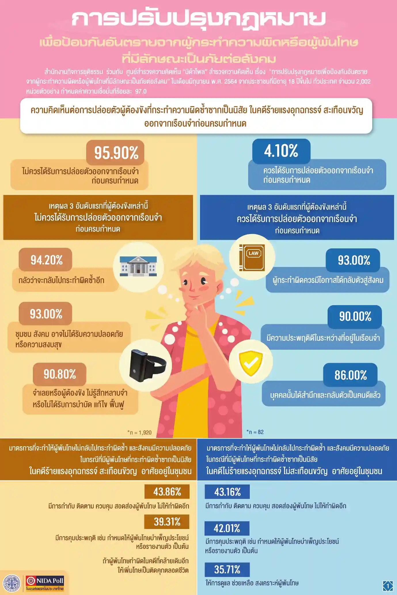 สำนักงานกิจการยุติธรรม กระทรวงยุติธรรม ร่วมกับ ศูนย์สำรวจความคิดเห็น “นิด้าโพล”สถาบันบัณฑิตพัฒนบริหารศาสตร์ (นิด้า) เปิดเผยผลสำรวจ เรื่อง “การปรับปรุงกฎหมายเพื่อป้องกันอันตรายจากผู้กระทำความผิดหรือผู้พ้นโทษที่มีลักษณะเป็นภัยต่อสังคม” ทำการสำรวจในเดือนมิถุนายน พ.ศ. 2564 จากประชาชนที่มีอายุ 18 ปีขึ้นไป กระจายทุกระดับการศึกษา อาชีพ และรายได้ รวมทั้งสิ้น จำนวน 2,002 หน่วยตัวอย่าง การสำรวจอาศัยการสุ่มตัวอย่าง โดยใช้ความน่าจะเป็นจากบัญชีรายชื่อฐานข้อมูลตัวอย่างหลัก (Master Sample) ของ “นิด้าโพล” สุ่มตัวอย่างด้วยวิธีแบบง่าย (Simple Random Sampling) เก็บข้อมูล ด้วยวิธีการสัมภาษณ์ทางโทรศัพท์ โดยกำหนดค่าความเชื่อมั่นที่ร้อยละ 97.0