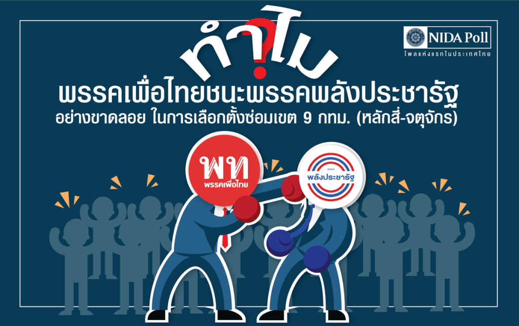 จากการสำรวจเมื่อถามประชาชนถึงสาเหตุที่พรรคเพื่อไทยชนะพรรคพลังประชารัฐอย่างขาดลอย ในการเลือกตั้งซ่อม เขต 9 กทม. (หลักสี่-จตุจักร) เมื่อวันที่ 30 มกราคม 2565 ที่ผ่านมา พบว่า ตัวอย่าง ร้อยละ 30.21 ระบุว่า ฐานคะแนนเดิมในพื้นที่ของพรรคเพื่อไทยดีกว่าพรรคพลังประชารัฐ รองลงมา ร้อยละ 30.14 ระบุว่า เป็นการส่งสัญญาณว่าประชาชนไม่พอใจการทำงานของรัฐบาล ร้อยละ 25.45 ระบุว่า ผู้สมัครของพรรคเพื่อไทยได้รับความนิยมในพื้นที่มากกว่าผู้สมัครของพรรคพลังประชารัฐ ร้อยละ 24.70 ระบุว่า เป็นการส่งสัญญาณว่าประชาชนไม่พอใจการทำงานของพรรคพลังประชารัฐ ร้อยละ 15.03 ระบุว่า เป็นการส่งสัญญาณว่าประชาชนไม่พอใจการทำงานของอดีต ส.ส. พรรคพลังประชารัฐ นายสิระ เจนจาคะ ร้อยละ 14.05 ระบุว่า เป็นการส่งสัญญาณว่าประชาชนไม่พอใจการทำงานของนายกรัฐมนตรี พลเอกประยุทธ์ จันทร์โอชา ร้อยละ 12.24 ระบุว่า พรรคเพื่อไทยมีกลยุทธ์ในการหาเสียงดีกว่าพรรคพลังประชารัฐ ร้อยละ 7.63 ระบุว่า เป็นการส่งสัญญาณว่าประชาชนไม่พอใจการทำงานของหัวหน้าพรรคพลังประชารัฐ พลเอกประวิตร วงษ์สุวรรณ ร้อยละ 6.42 ระบุว่า เป็นการส่งสัญญาณว่าประชาชนพอใจการทำงานของพรรคเพื่อไทยในฐานะฝ่ายค้าน ร้อยละ 1.96 ระบุว่า พรรคพลังประชารัฐแพ้ให้กับกระแสของ ดร.ทักษิณ ชินวัตร ร้อยละ 0.68 ระบุว่า ผู้อำนวยการการเลือกตั้งของพรรคพลังประชารัฐไม่ใช่ ร้อยเอกธรรมนัส พรหมเผ่า และร้อยละ 0.38 ระบุว่า เฉย ๆ/ไม่ตอบ/ไม่สนใจ