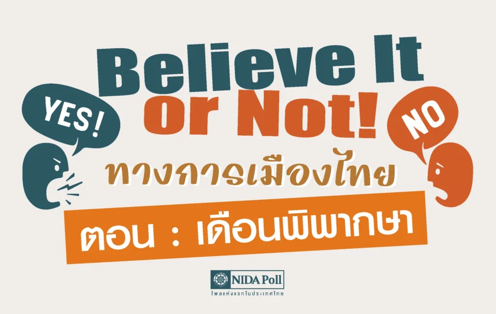 ศูนย์สำรวจความคิดเห็น นิด้าโพล สถาบันบัณฑิตพัฒนบริหารศาสตร์ (นิด้า) เปิดเผยผลการสำรวจของประชาชน เรื่อง Believe It or Not! ทางการเมืองไทย ตอน เดือนพิพากษา ทำการสำรวจระหว่างวันที่ 25 กรกฎาคม ถึง 1 สิงหาคม 2567