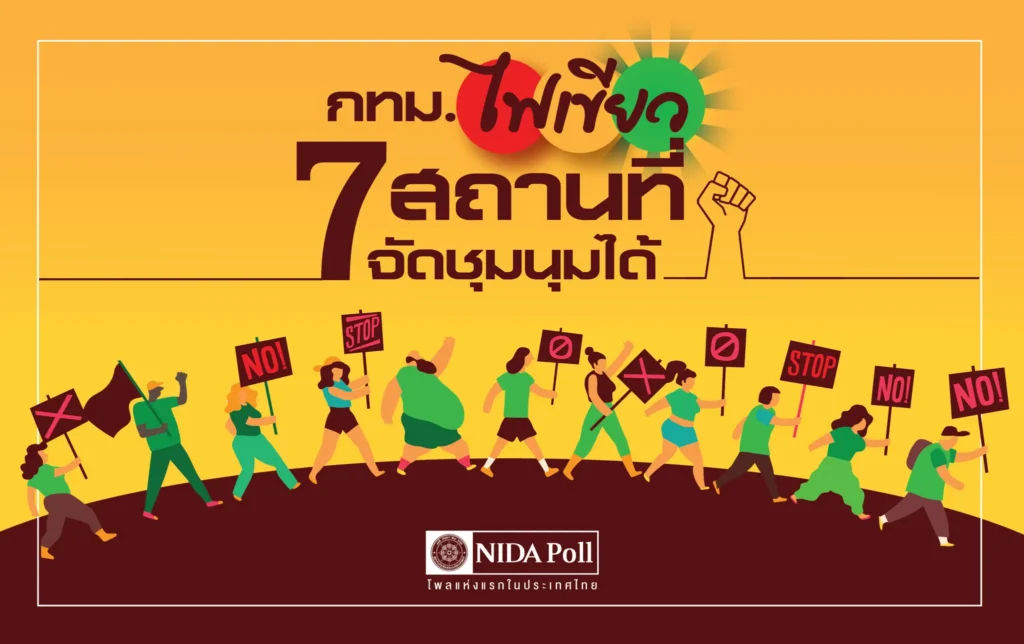 ศูนย์สำรวจความคิดเห็น นิด้าโพล สถาบันบัณฑิตพัฒนบริหารศาสตร์ (นิด้า) เปิดเผยผลสำรวจของประชาชน เรื่อง กทม. ไฟเขียว 7 สถานที่ จัดชุมนุมได้ ทำการสำรวจระหว่างวันที่ 27-29 มิถุนายน 2565 จากประชาชนที่มีอายุ 18 ปีขึ้นไป และมีภูมิลำเนาตามทะเบียนบ้านอยู่กรุงเทพมหานคร กระจายทุกระดับการศึกษา อาชีพ และรายได้ รวมทั้งสิ้น จำนวน 1,310 หน่วยตัวอย่าง เกี่ยวกับการจัดให้มีสถานที่ใช้สำหรับการชุมนุมสาธารณะ 7 แห่ง ในกรุงเทพฯ การสำรวจอาศัยการสุ่มตัวอย่างโดยใช้ความน่าจะเป็นจากบัญชีรายชื่อฐานข้อมูลตัวอย่างหลัก (Master Sample) ของ นิด้าโพล สุ่มตัวอย่างด้วยวิธีแบบง่าย (Simple Random Sampling) เก็บข้อมูลด้วยวิธีการสัมภาษณ์ทางโทรศัพท์ โดยกำหนดค่าความเชื่อมั่น ร้อยละ 97.0