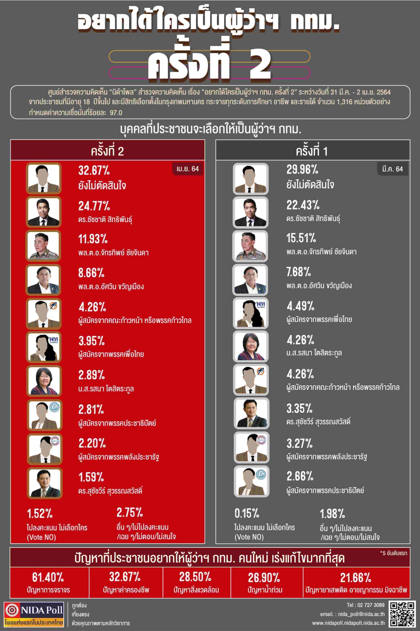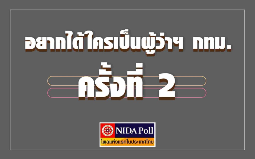 ศูนย์สำรวจความคิดเห็น “นิด้าโพล” สถาบันบัณฑิตพัฒนบริหารศาสตร์ (นิด้า) เปิดเผยผลสำรวจของประชาชน เรื่อง “อยากได้ใครเป็นผู้ว่าฯกทม. ครั้งที่ 2” ทำการสำรวจระหว่างวันที่ 31 มีนาคม – 2 เมษายน 2564 จากประชาชนที่มีอายุ 18 ปีขึ้นไป และมีสิทธิเลือกตั้งในกรุงเทพมหานคร กระจายทุกระดับการศึกษา อาชีพ และรายได้ รวมทั้งสิ้น จำนวน 1,316 หน่วยตัวอย่าง เกี่ยวกับประชาชนอยากได้ใครเป็น ผู้ว่าฯ กทม. ครั้งที่ 2 การสำรวจอาศัยการสุ่มตัวอย่างโดยใช้ความน่าจะเป็นจากบัญชีรายชื่อฐานข้อมูลตัวอย่างหลัก (Master Sample) ของ “นิด้าโพล” สุ่มตัวอย่างด้วยวิธีแบบง่าย (Simple Random Sampling) เก็บข้อมูลด้วยวิธีการสัมภาษณ์ทางโทรศัพท์ โดยกำหนดค่าความเชื่อมั่นที่ร้อยละ 97.0