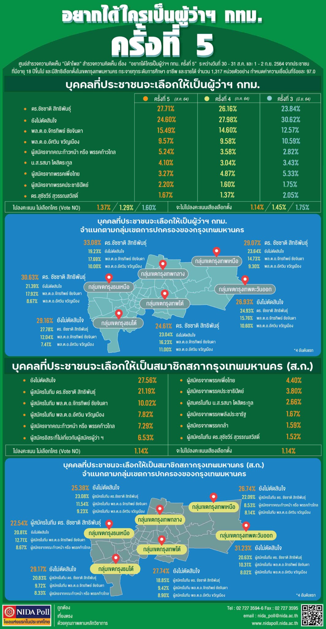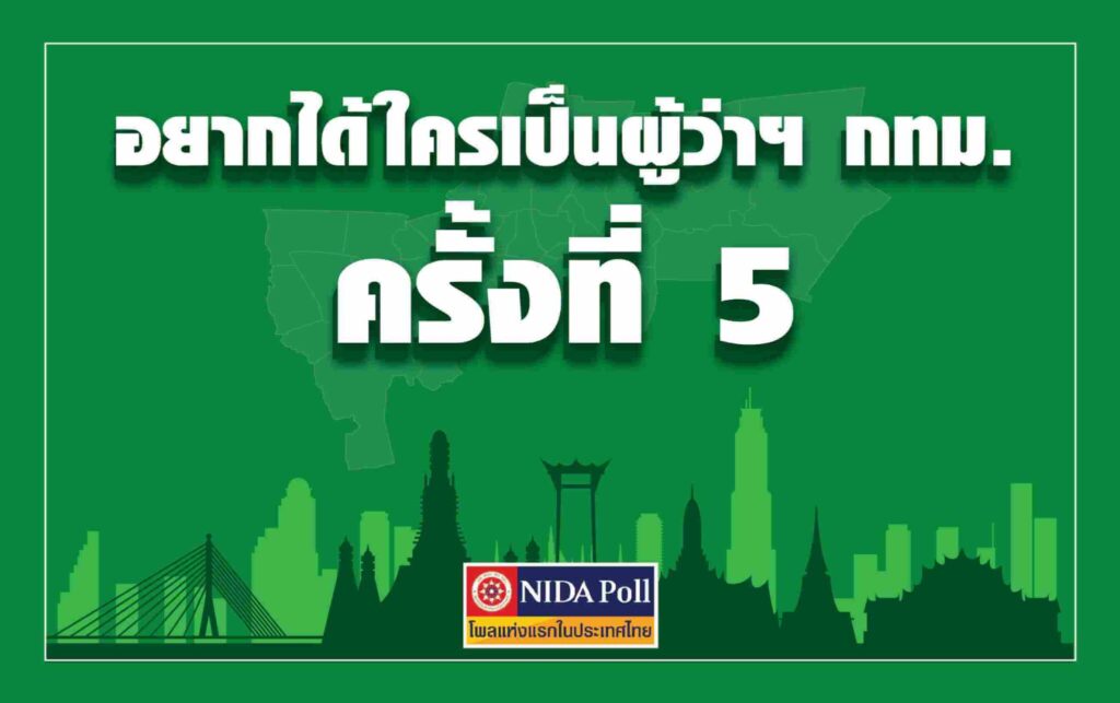 ศูนย์สำรวจความคิดเห็น “นิด้าโพล” สถาบันบัณฑิตพัฒนบริหารศาสตร์ (นิด้า) เปิดเผยผลสำรวจของประชาชน เรื่อง “อยากได้ใครเป็นผู้ว่าฯ กทม. ครั้งที่ 5” ทำการสำรวจระหว่างวันที่ 30 – 31 สิงหาคม และ 1 – 2 กันยายน 2564 จากประชาชนที่มีอายุ 18 ปีขึ้นไป และมีสิทธิเลือกตั้งในกรุงเทพมหานคร กระจายทุกระดับการศึกษา อาชีพ และรายได้ รวมทั้งสิ้น จำนวน 1,317 หน่วยตัวอย่าง เกี่ยวกับประชาชนอยากได้ใครเป็นผู้ว่าฯ กทม. ครั้งที่ 5 การสำรวจอาศัยการสุ่มตัวอย่างโดยใช้ความน่าจะเป็นจากบัญชีรายชื่อฐานข้อมูลตัวอย่างหลัก (Master Sample) ของ “นิด้าโพล” สุ่มตัวอย่างด้วยวิธีแบบง่าย (Simple Random Sampling) เก็บข้อมูลด้วยวิธีการสัมภาษณ์ทางโทรศัพท์ โดยกำหนดค่าความเชื่อมั่นที่ ร้อยละ 97.0