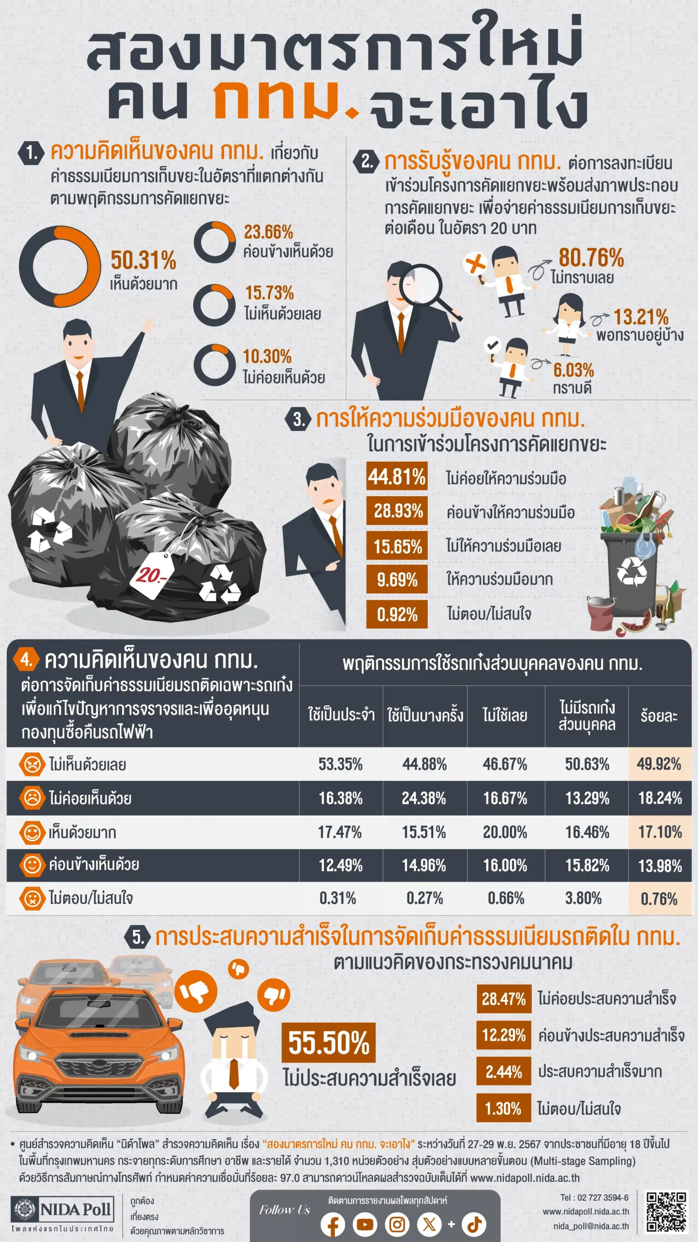 ศูนย์สำรวจความคิดเห็น นิด้าโพล สถาบันบัณฑิตพัฒนบริหารศาสตร์ (นิด้า) เปิดเผยผลการสำรวจของประชาชน เรื่อง สองมาตรการใหม่ คน กทม. จะเอาไง ทำการสำรวจระหว่างวันที่ 27-29 พฤศจิกายน 2567 จากประชาชนที่มีอายุ 18 ปีขึ้นไป ในพื้นที่กรุงเทพมหานคร กระจายระดับการศึกษา อาชีพ และรายได้ รวมจำนวนทั้งสิ้น 1,310 หน่วยตัวอย่าง เกี่ยวกับความคิดเห็นของคนกรุงเทพมหานคร หากมีการใช้มาตรการจัดเก็บค่าธรรมเนียมการเก็บขยะและค่าธรรมเนียมรถติดในพื้นที่กรุงเทพมหานคร การสำรวจอาศัยการสุ่มตัวอย่างโดยใช้ความน่าจะเป็นจากบัญชีรายชื่อฐานข้อมูลตัวอย่างหลัก (Master Sample) ของ นิด้าโพล สุ่มตัวอย่างแบบหลายขั้นตอน (Multi-stage Sampling) เก็บข้อมูลด้วยวิธีการสัมภาษณ์ทางโทรศัพท์ โดยกำหนดค่าความเชื่อมั่น ร้อยละ 97.0