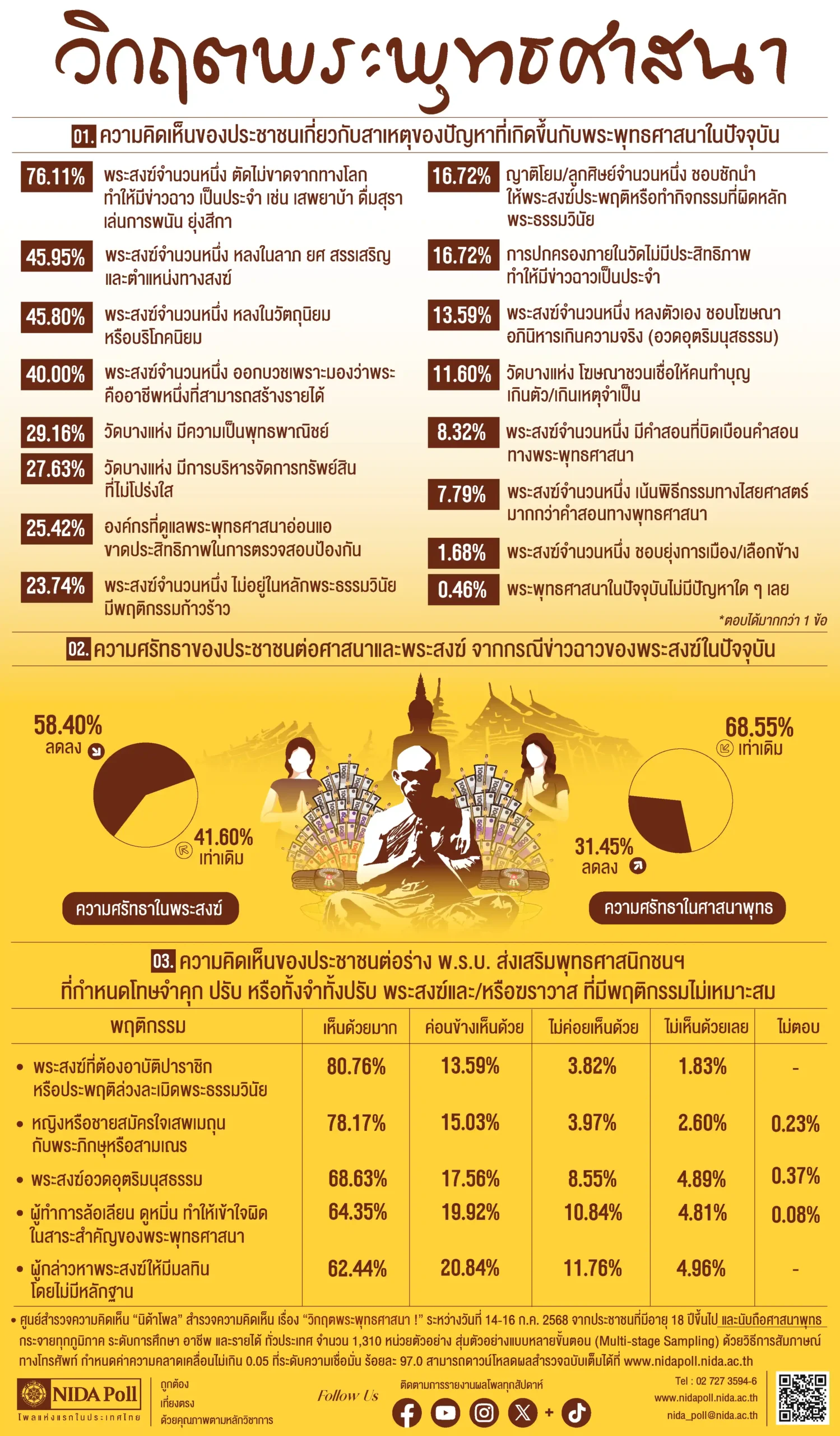 ศูนย์สำรวจความคิดเห็น “นิด้าโพล” สถาบันบัณฑิตพัฒนบริหารศาสตร์ (นิด้า) เปิดเผยผลการสำรวจ เรื่อง “วิกฤตพระพุทธศาสนา !” ทำการสำรวจระหว่างวันที่ 14-16 กรกฎาคม 2568 จากประชาชนที่มีอายุ 18 ปีขึ้นไป และนับถือศาสนาพุทธ กระจายทุกภูมิภาค ระดับการศึกษา อาชีพ และรายได้ ทั่วประเทศ รวมจำนวนทั้งสิ้น 1,310 หน่วยตัวอย่าง เกี่ยวกับปัญหาที่เกิดขึ้นกับพระพุทธศาสนาในปัจจุบัน การสำรวจอาศัยการสุ่มตัวอย่างโดยใช้ความน่าจะเป็นจากบัญชีรายชื่อฐานข้อมูลตัวอย่างหลัก (Master Sample) ของ “นิด้าโพล” สุ่มตัวอย่างแบบหลายขั้นตอน (Multi-stage Sampling) เก็บข้อมูลด้วยวิธีการสัมภาษณ์ทางโทรศัพท์ โดยกำหนดค่าความคลาดเคลื่อนไม่เกิน 0.05 ที่ระดับความเชื่อมั่น ร้อยละ 97.0