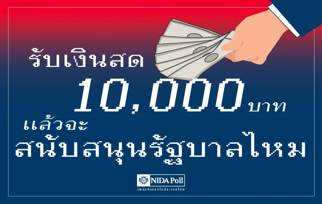 ศูนย์สำรวจความคิดเห็น นิด้าโพล สถาบันบัณฑิตพัฒนบริหารศาสตร์ (นิด้า) เปิดเผยผลการสำรวจของประชาชน เรื่อง รับเงินสด 10,000 บาท แล้วจะสนับสนุนรัฐบาลไหม ทำการสำรวจระหว่างวันที่ 1-3 ตุลาคม 2567 จากประชาชนที่มีอายุ 18 ปีขึ้นไป ที่ทั้งตนเอง และ/หรือคนในครอบครัว ที่ได้รับเงิน 10,000 บาทจากโครงการกระตุ้นเศรษฐกิจปี 2567 กระจายทุกภูมิภาค ระดับการศึกษา อาชีพ และรายได้ ทั่วประเทศ รวมทั้งสิ้น จำนวน 1,310 หน่วยตัวอย่าง เกี่ยวกับการได้รับเงินสด 10,000 บาท จากรัฐบาล การสำรวจอาศัยการสุ่มตัวอย่างโดยใช้ความน่าจะเป็นจากบัญชีรายชื่อฐานข้อมูลตัวอย่างหลัก (Master Sample) ของ นิด้าโพล สุ่มตัวอย่างแบบหลายขั้นตอน (Multi-stage Sampling) เก็บข้อมูลด้วยวิธีการสัมภาษณ์ทางโทรศัพท์ โดยกำหนดค่าความเชื่อมั่น ร้อยละ 97.0