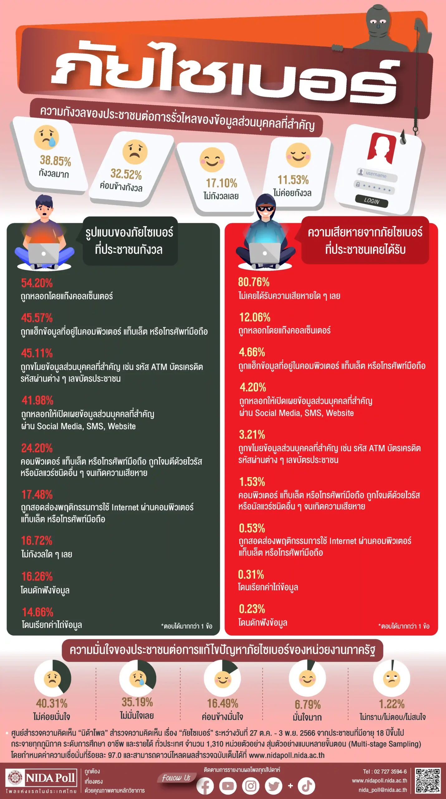 จากการสำรวจเมื่อถามถึงความกังวลของประชาชนต่อการรั่วไหลของข้อมูลส่วนบุคคลที่สำคัญ (เช่น เลขบัตรประชาชน รหัสผ่านต่าง ๆ เลขที่บัญชีธนาคาร รูปภาพส่วนตัว เป็นต้น) พบว่า ตัวอย่าง ร้อยละ 38.85 ระบุว่า กังวลมาก รองลงมา ร้อยละ 32.52 ระบุว่า ค่อนข้างกังวล ร้อยละ 17.10 ระบุว่า ไม่กังวลเลย และร้อยละ 11.53 ระบุว่า ไม่ค่อยกังวล ด้านรูปแบบของภัยไซเบอร์ที่ประชาชนกังวล พบว่า ตัวอย่าง ร้อยละ 54.20 ระบุว่า ถูกหลอกโดยแก๊งคอลเซ็นเตอร์ รองลงมา ร้อยละ 45.57 ระบุว่า ถูกแฮ็กข้อมูลที่อยู่ในคอมพิวเตอร์ แท็บเล็ต หรือโทรศัพท์มือถือ ร้อยละ 45.11 ระบุว่า ถูกขโมยข้อมูลส่วนบุคคลที่สำคัญ