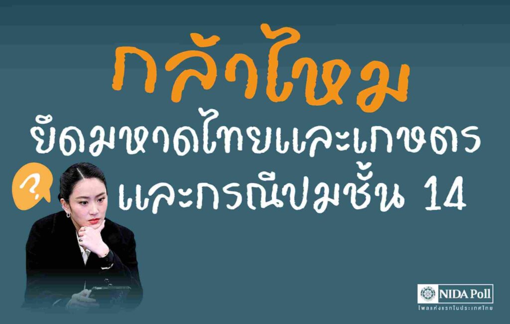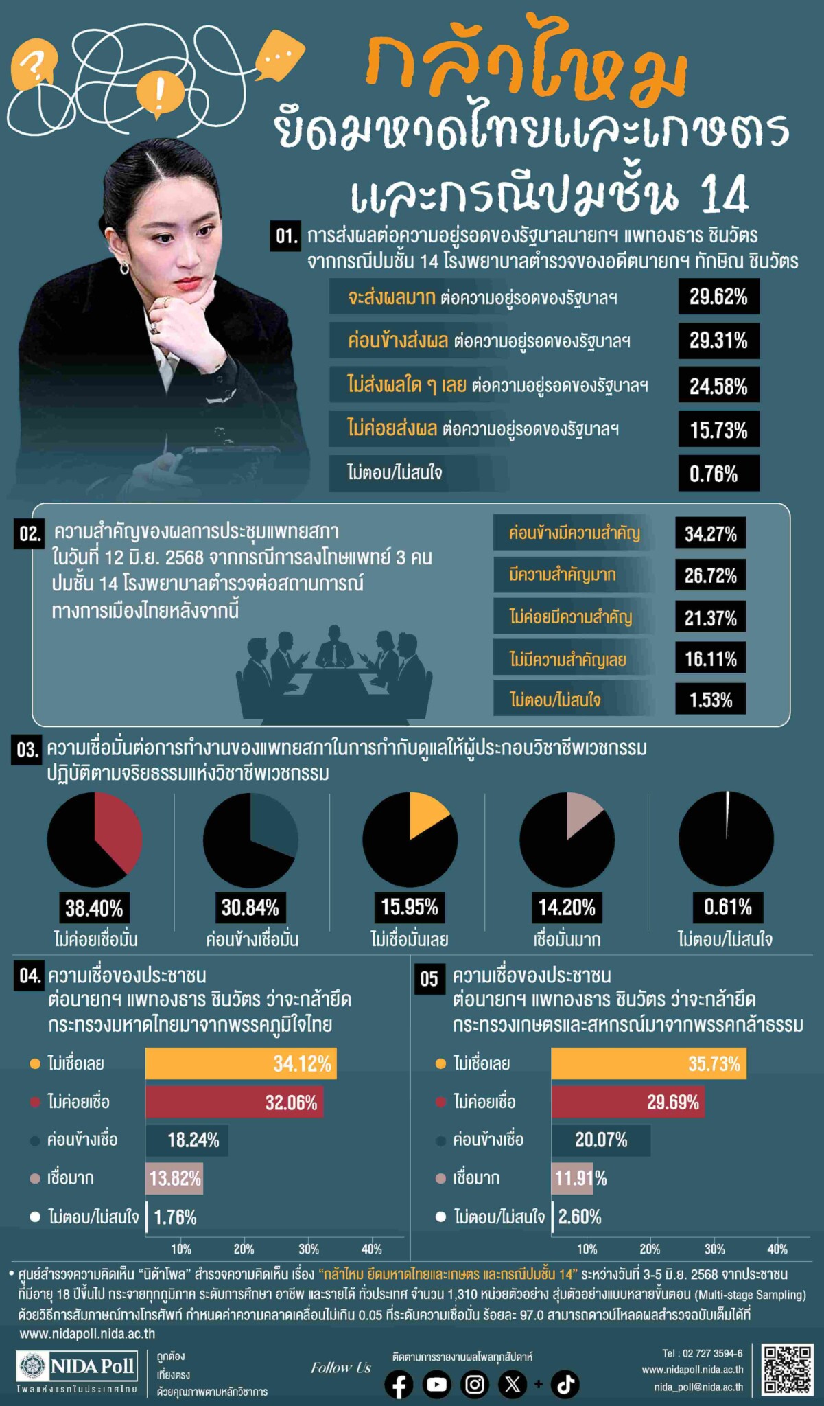 ศูนย์สำรวจความคิดเห็น “นิด้าโพล” สถาบันบัณฑิตพัฒนบริหารศาสตร์ (นิด้า) เปิดเผยผลการสำรวจ เรื่อง “กล้าไหมยึดมหาดไทยและเกษตรและกรณีปมชั้น 14” ทำการสำรวจระหว่างวันที่ 3-5 มิถุนายน 2568 จากประชาชนที่มีอายุ 18 ปีขึ้นไป กระจายทุกภูมิภาค ระดับการศึกษา อาชีพ และรายได้ ทั่วประเทศ รวมจำนวนทั้งสิ้น 1,310 หน่วยตัวอย่าง เกี่ยวกับความเชื่อมั่นของประชาชนต่อกรณีปมชั้น 14 โรงพยาบาลตำรวจ ของอดีตนายกรัฐมนตรีทักษิณ ชินวัตร การสำรวจอาศัยการสุ่มตัวอย่างโดยใช้ความน่าจะเป็นจากบัญชีรายชื่อฐานข้อมูลตัวอย่างหลัก (Master Sample) ของ “นิด้าโพล” สุ่มตัวอย่างแบบหลายขั้นตอน (Multi-stage Sampling) เก็บข้อมูลด้วยวิธีการสัมภาษณ์ ทางโทรศัพท์ โดยกำหนดค่าความคลาดเคลื่อนไม่เกิน 0.05 ที่ระดับความเชื่อมั่น ร้อยละ 97.0