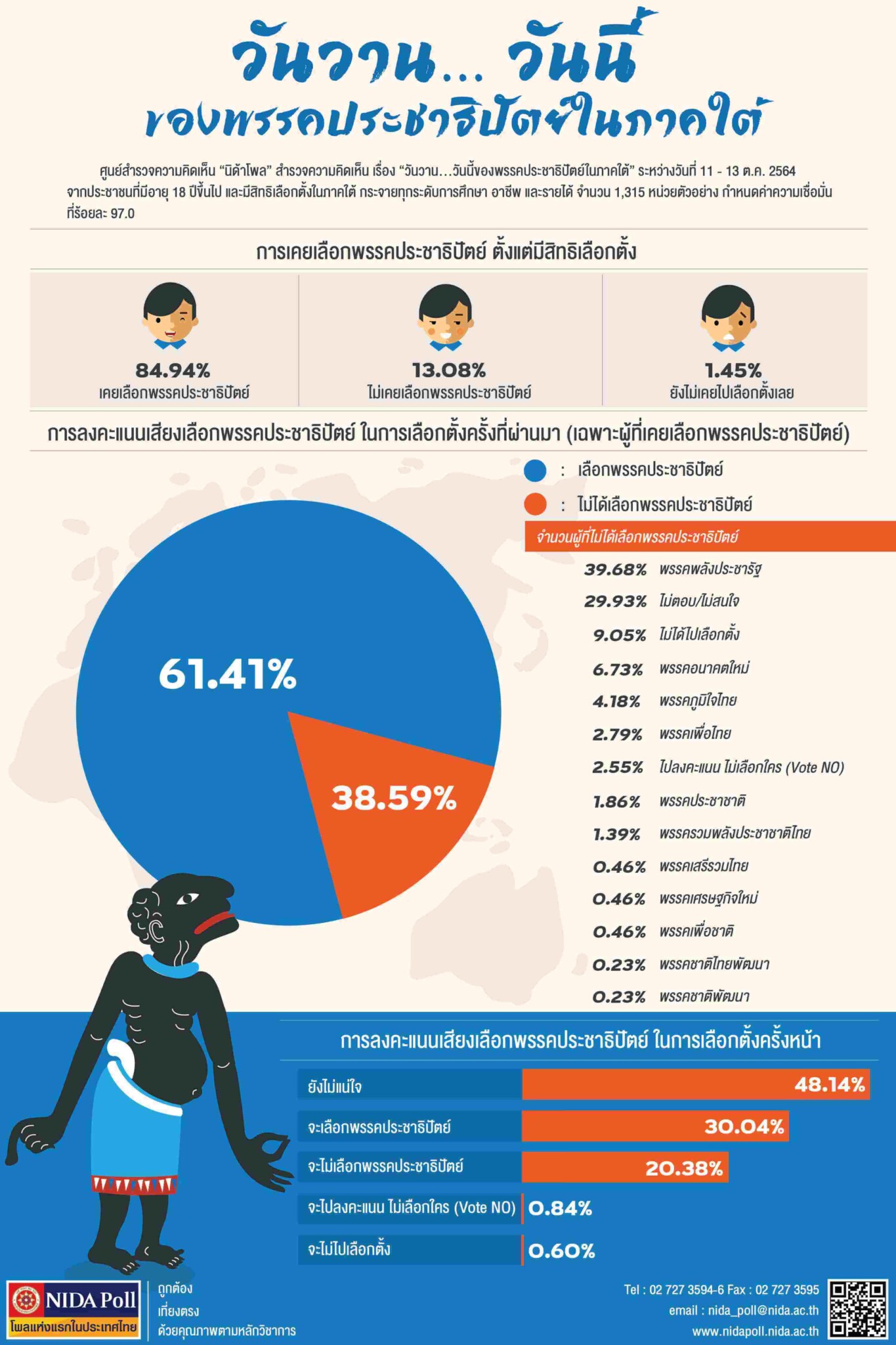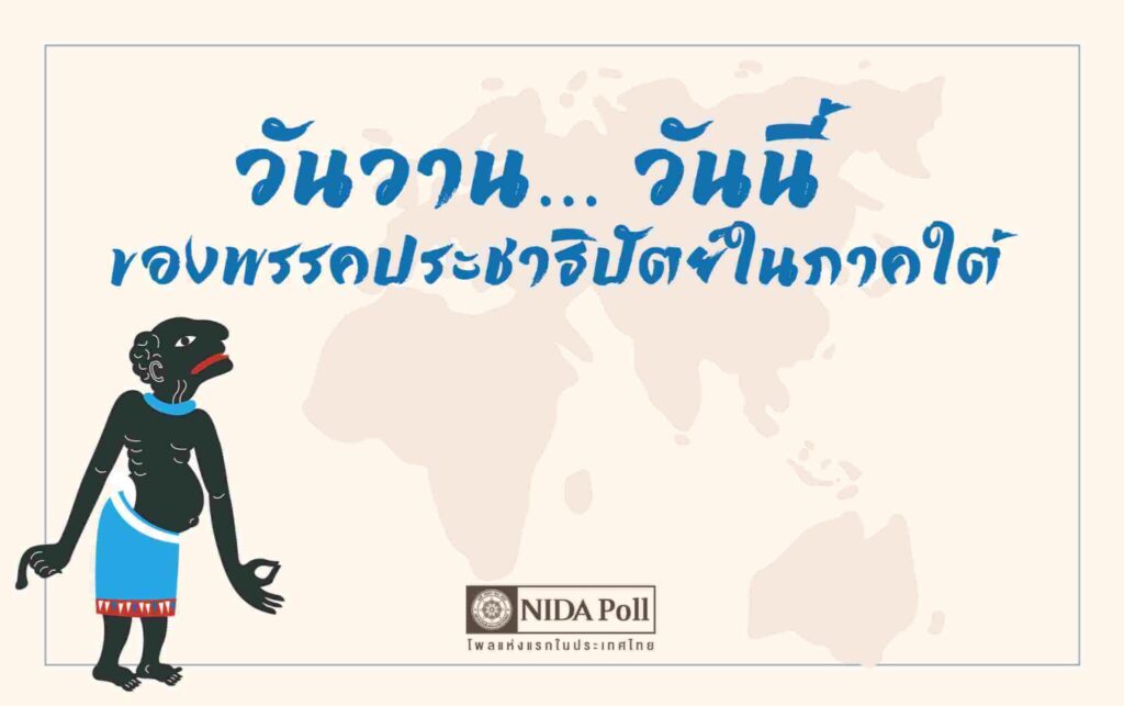 ศูนย์สำรวจความคิดเห็น “นิด้าโพล” สถาบันบัณฑิตพัฒนบริหารศาสตร์ (นิด้า) เปิดเผยผลสำรวจของประชาชน เรื่อง “วันวาน…วันนี้ ของพรรคประชาธิปัตย์ในภาคใต้” ทำการสำรวจระหว่างวันที่ 11 – 13 ตุลาคม 2564 จากประชาชนที่มีอายุ 18 ปีขึ้นไป และมีสิทธิเลือกตั้งในภาคใต้ กระจายทุกระดับการศึกษา อาชีพ และรายได้ รวมทั้งสิ้น จำนวน 1,315 หน่วยตัวอย่าง เกี่ยวกับวันวาน…วันนี้ของพรรคประชาธิปัตย์ในภาคใต้ การสำรวจอาศัยการสุ่มตัวอย่างโดยใช้ความน่าจะเป็นจากบัญชีรายชื่อฐานข้อมูลตัวอย่างหลัก (Master Sample) ของ “นิด้าโพล” สุ่มตัวอย่างด้วยวิธีแบบง่าย (Simple Random Sampling) เก็บข้อมูลด้วยวิธีการสัมภาษณ์ทางโทรศัพท์ โดยกำหนดค่าความเชื่อมั่นที่ร้อยละ 97.0