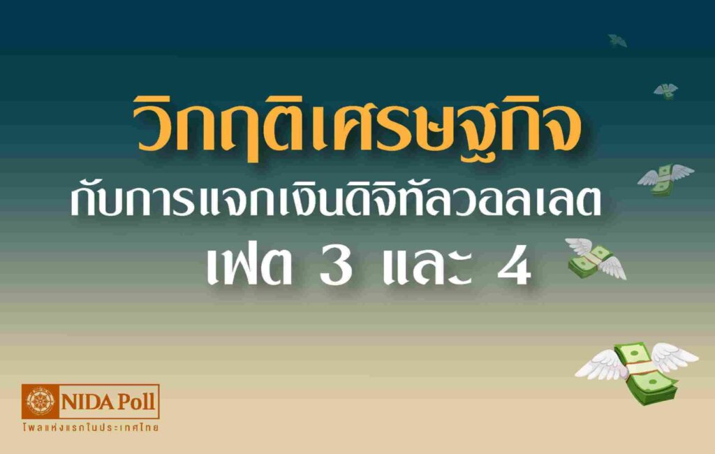 ศูนย์สำรวจความคิดเห็น “นิด้าโพล” สถาบันบัณฑิตพัฒนบริหารศาสตร์ (นิด้า) เปิดเผยผลการสำรวจเรื่อง “วิกฤติเศรษฐกิจกับการแจกเงินดิจิทัลวอลเล็ตเฟส 3 และเฟส 4” ทำการสำรวจระหว่างวันที่ 7-8 พฤษภาคม 2568 จากประชาชนที่มีอายุ 18 ปีขึ้นไป กระจายทุกภูมิภาค ระดับการศึกษา อาชีพ และรายได้ ทั่วประเทศ รวมจำนวนทั้งสิ้น 1,310 หน่วยตัวอย่าง เกี่ยวกับวิกฤติเศรษฐกิจกับการแจกเงินดิจิทัลวอลเล็ต 10,000 บาท การสำรวจอาศัยการสุ่มตัวอย่างโดยใช้ความน่าจะเป็นจากบัญชีรายชื่อฐานข้อมูลตัวอย่างหลัก (Master Sample) ของ “นิด้าโพล”สุ่มตัวอย่างแบบหลายขั้นตอน (Multi-stage Sampling) เก็บข้อมูลด้วยวิธีการสัมภาษณ์ทางโทรศัพท์ โดยกำหนดค่าความคลาดเคลื่อนไม่เกิน 0.05 ที่ระดับความเชื่อมั่น ร้อยละ 97.0