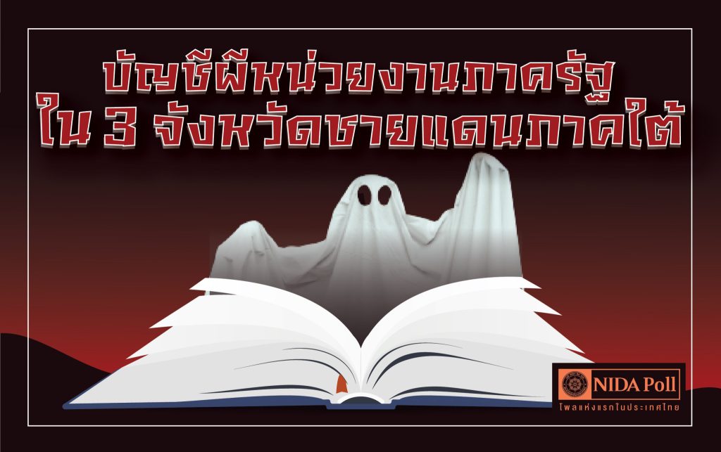 ศูนย์สำรวจความคิดเห็น “นิด้าโพล” สถาบันบัณฑิตพัฒนบริหารศาสตร์ (นิด้า) เปิดเผยผลสำรวจของประชาชน เรื่อง บัญชีผีหน่วยงานภาครัฐใน 3 จังหวัดชายแดนภาคใต้” ทำการสำรวจระหว่างวันที่ 30 สิงหาคม ถึง 1 กันยายน 2565 จากประชาชนที่มีอายุ 18 ปีขึ้นไป และมีภูมิลำเนาอยู่ในจังหวัดปัตตานี ยะลา และนราธิวาส กระจายทุกระดับการศึกษา อาชีพ และรายได้ รวมทั้งสิ้น จำนวน 1,102 หน่วยตัวอย่าง เกี่ยวกับปัญหาบัญชีผีหน่วยงานภาครัฐใน 3 จังหวัดชายแดนภาคใต้ การสำรวจอาศัยการสุ่มตัวอย่างโดยใช้ความน่าจะเป็นจากบัญชีรายชื่อฐานข้อมูลตัวอย่างหลัก (Master Sample) ของ “นิด้าโพล” สุ่มตัวอย่างด้วยวิธีแบบง่าย  (Simple Random Sampling) เก็บข้อมูลด้วยวิธีการสัมภาษณ์ทางโทรศัพท์ โดยกำหนดค่าความเชื่อมั่น ร้อยละ 95.0