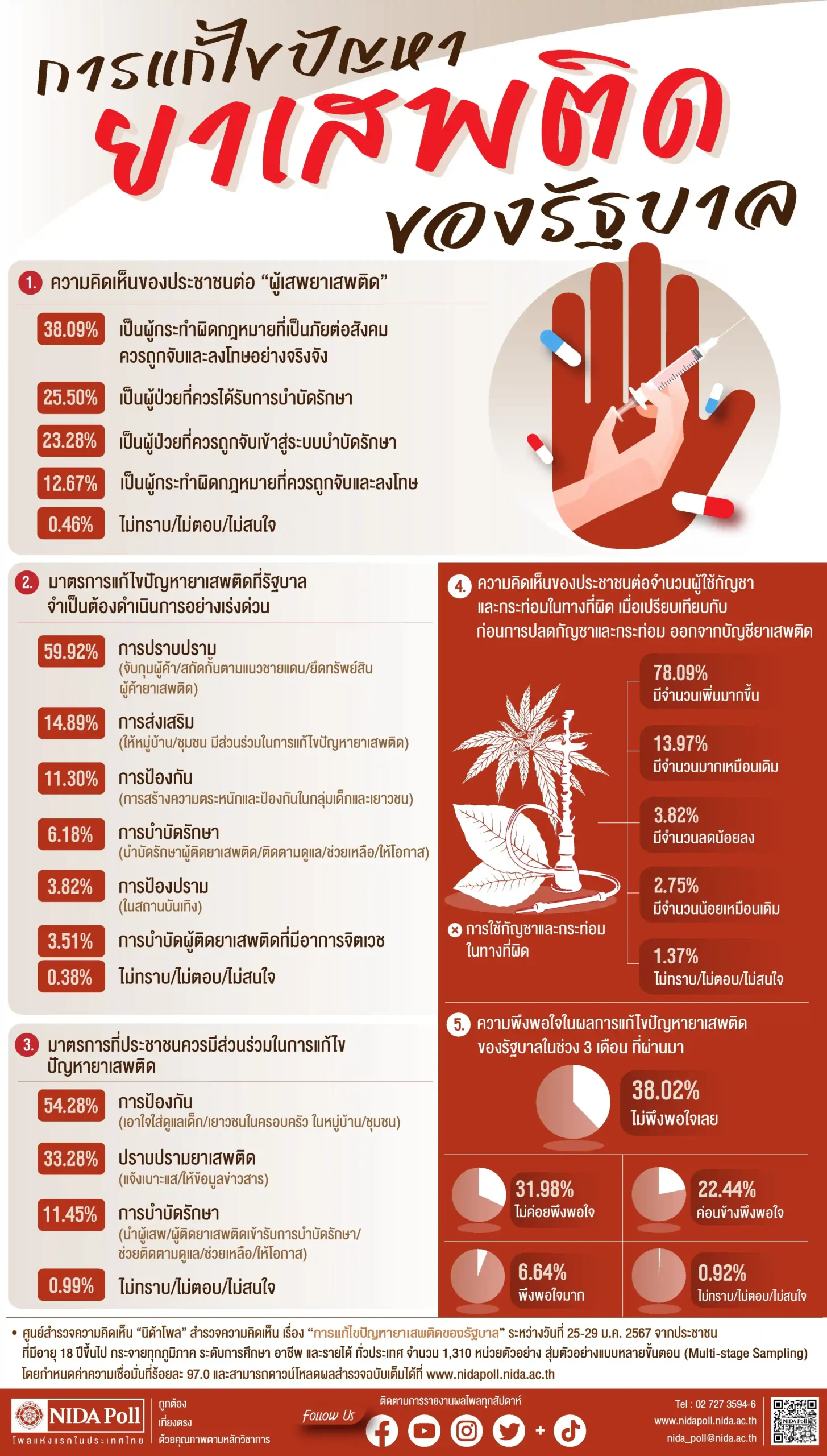 ศูนย์สำรวจความคิดเห็น นิด้าโพล สถาบันบัณฑิตพัฒนบริหารศาสตร์ (นิด้า) เปิดเผยผลสำรวจของประชาชน เรื่อง การแก้ไขปัญหา ยาเสพติดของรัฐบาล ทำการสำรวจระหว่าง วันที่ 25-29 มกราคม 2567 จากประชาชนที่มีอายุ 18 ปีขึ้นไป กระจายทุกภูมิภาค ระดับการศึกษา อาชีพ และรายได้ ทั่วประเทศ รวมทั้งสิ้น จำนวน 1,310 หน่วยตัวอย่าง เกี่ยวกับการแก้ไขปัญหายาเสพติดของรัฐบาล การสำรวจอาศัยการสุ่มตัวอย่างโดยใช้ความน่าจะเป็นจากบัญชีรายชื่อฐานข้อมูลตัวอย่างหลัก (Master Sample) ของ นิด้าโพล สุ่มตัวอย่างแบบหลายขั้นตอน (Multi-stage Sampling) เก็บข้อมูลด้วยวิธีการสัมภาษณ์ทางโทรศัพท์ โดยกำหนดค่าความเชื่อมั่น ร้อยละ 97.0