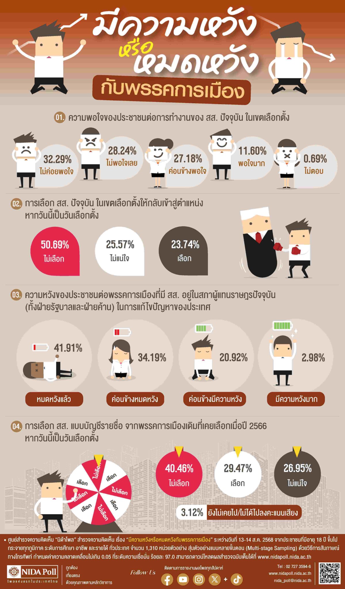 ศูนย์สำรวจความคิดเห็น “นิด้าโพล” สถาบันบัณฑิตพัฒนบริหารศาสตร์ (นิด้า) เปิดเผยผลการสำรวจ เรื่อง “มีความหวังหรือหมดหวังกับพรรคการเมือง” ทำการสำรวจระหว่างวันที่ 13-14 สิงหาคม 2568 จากประชาชนที่มีอายุ 18 ปีขึ้นไป กระจายทุกภูมิภาค ระดับการศึกษา อาชีพ และรายได้ ทั่วประเทศ รวมจำนวนทั้งสิ้น 1,310 หน่วยตัวอย่าง เกี่ยวกับการทำงานของสมาชิกสภาผู้แทนราษฎร (สส.) ปัจจุบัน ในเขตเลือกตั้ง การสำรวจอาศัย การสุ่มตัวอย่างโดยใช้ความน่าจะเป็นจากบัญชีรายชื่อฐานข้อมูลตัวอย่างหลัก (Master Sample) ของ “นิด้าโพล” สุ่มตัวอย่างแบบหลายขั้นตอน (Multi-stage Sampling) เก็บข้อมูลด้วยวิธีการสัมภาษณ์ทางโทรศัพท์ โดยกำหนด ค่าความคลาดเคลื่อนไม่เกิน 0.05 ที่ระดับความเชื่อมั่น ร้อยละ 97.0