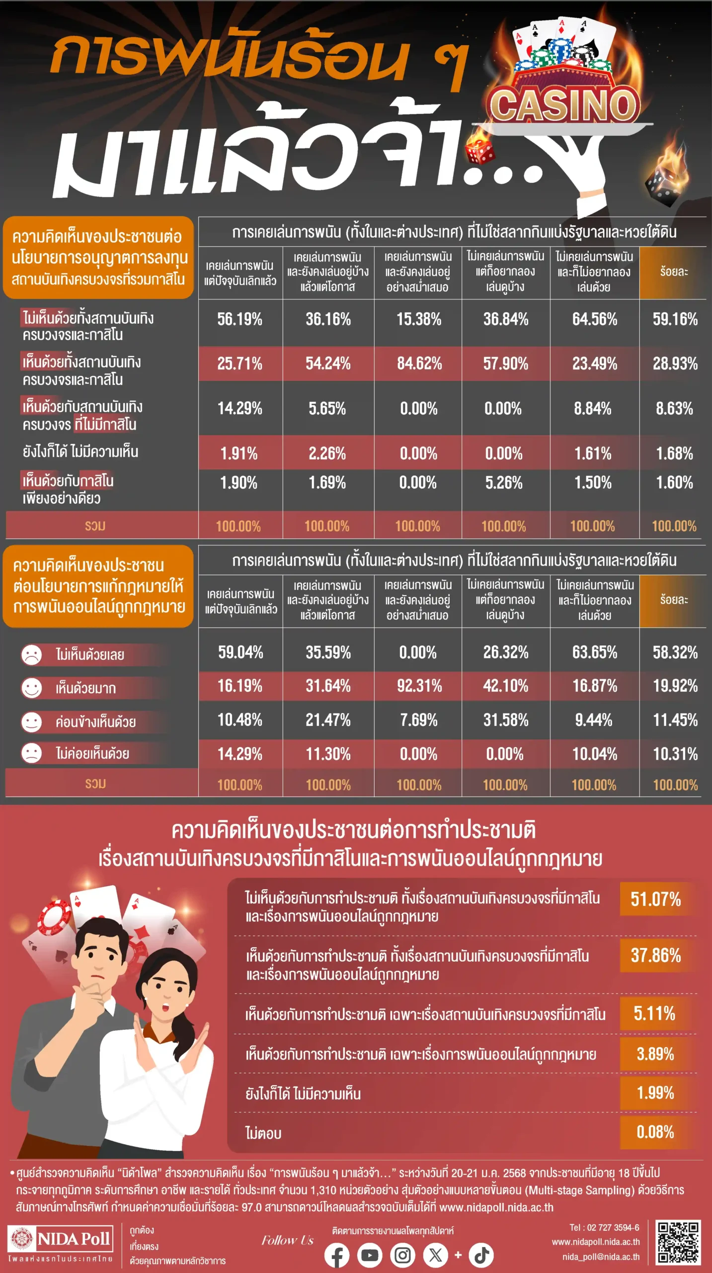 ศูนย์สำรวจความคิดเห็น “นิด้าโพล” สถาบันบัณฑิตพัฒนบริหารศาสตร์ (นิด้า) เปิดเผยผลการสำรวจของประชาชน เรื่อง “การพนันร้อนๆมาแล้วจ้า …” ทำการสำรวจระหว่างวันที่ 20-21 มกราคม 2568 จากประชาชนที่มีอายุ 18 ปีขึ้นไป กระจายทุกภูมิภาค ระดับการศึกษา อาชีพ และรายได้ ทั่วประเทศ รวมจำนวนทั้งสิ้น 1,310 หน่วยตัวอย่าง เกี่ยวกับความคิดเห็นของประชาชนที่มีต่อเรื่องสถานบันเทิงครบวงจร (Entertainment Complex) การสำรวจอาศัยการสุ่มตัวอย่างโดยใช้ความน่าจะเป็นจากบัญชีรายชื่อฐานข้อมูลตัวอย่างหลัก (Master Sample) ของ “นิด้าโพล”สุ่มตัวอย่างแบบหลายขั้นตอน (Multi-stage Sampling) เก็บข้อมูลด้วยวิธีการสัมภาษณ์ทางโทรศัพท์ โดยกำหนดค่าความเชื่อมั่น ร้อยละ 97.0