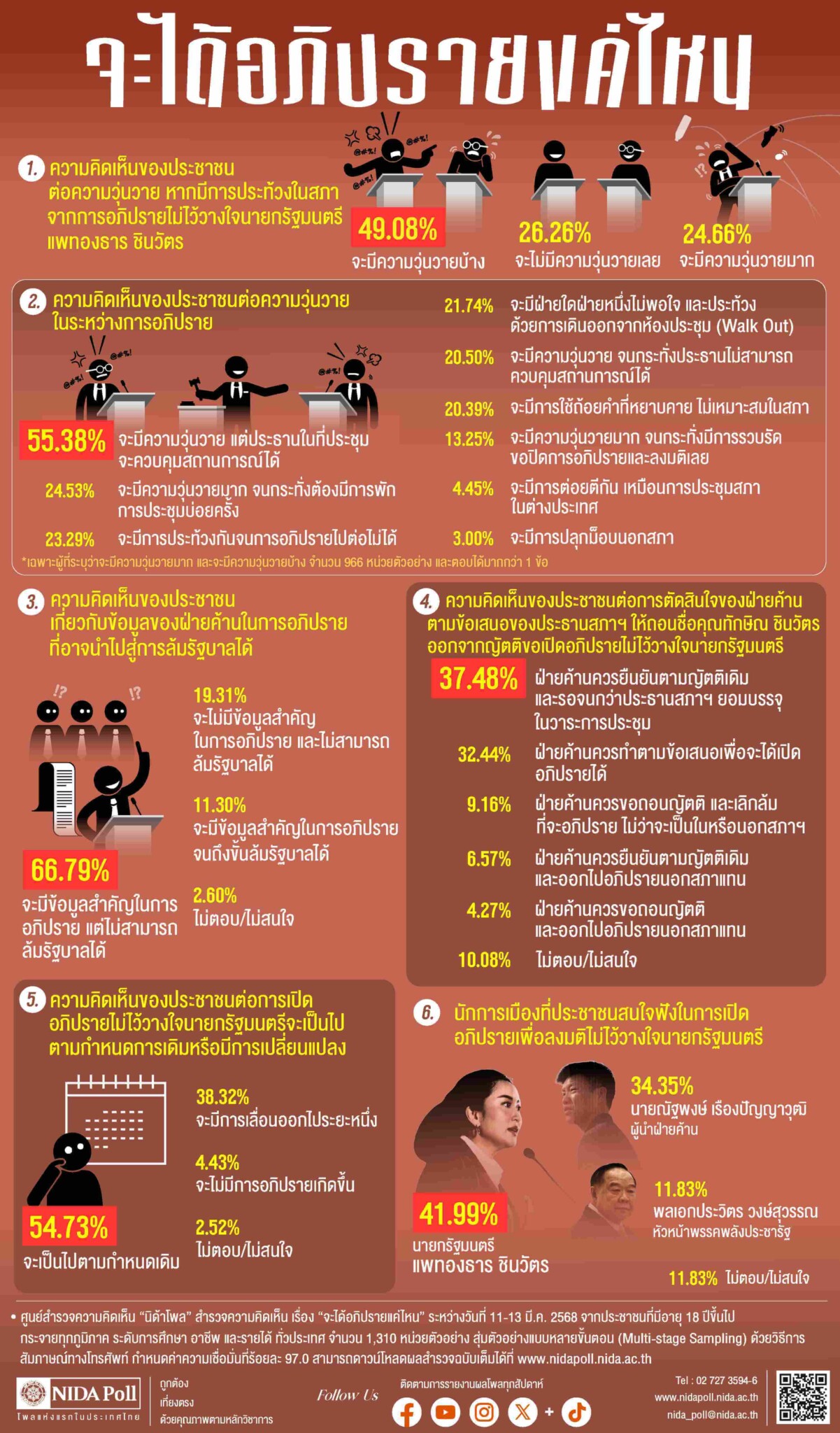ศูนย์สำรวจความคิดเห็น “นิด้าโพล” สถาบันบัณฑิตพัฒนบริหารศาสตร์ (นิด้า) เปิดเผยผลการสำรวจ เรื่อง “จะได้อภิปรายแค่ไหน” ทำการสำรวจระหว่างวันที่ 11-13 มีนาคม 2568 จากประชาชนที่มีอายุ 18 ปีขึ้นไป กระจายทุกภูมิภาค ระดับการศึกษา อาชีพ และรายได้ ทั่วประเทศ รวมจำนวนทั้งสิ้น 1,310 หน่วยตัวอย่าง เกี่ยวกับเหตุการณ์ที่จะเกิดขึ้นในสภา จากการเปิดอภิปรายไม่ไว้วางใจนายกรัฐมนตรี แพทองธาร ชินวัตร การสำรวจอาศัยการสุ่มตัวอย่างโดยใช้ความน่าจะเป็นจากบัญชีรายชื่อฐานข้อมูลตัวอย่างหลัก (Master Sample) ของ “นิด้าโพล” สุ่มตัวอย่างแบบหลายขั้นตอน (Multi-stage Sampling) เก็บข้อมูลด้วยวิธีการสัมภาษณ์ทางโทรศัพท์ โดยกำหนดค่าความเชื่อมั่น ร้อยละ 97.0