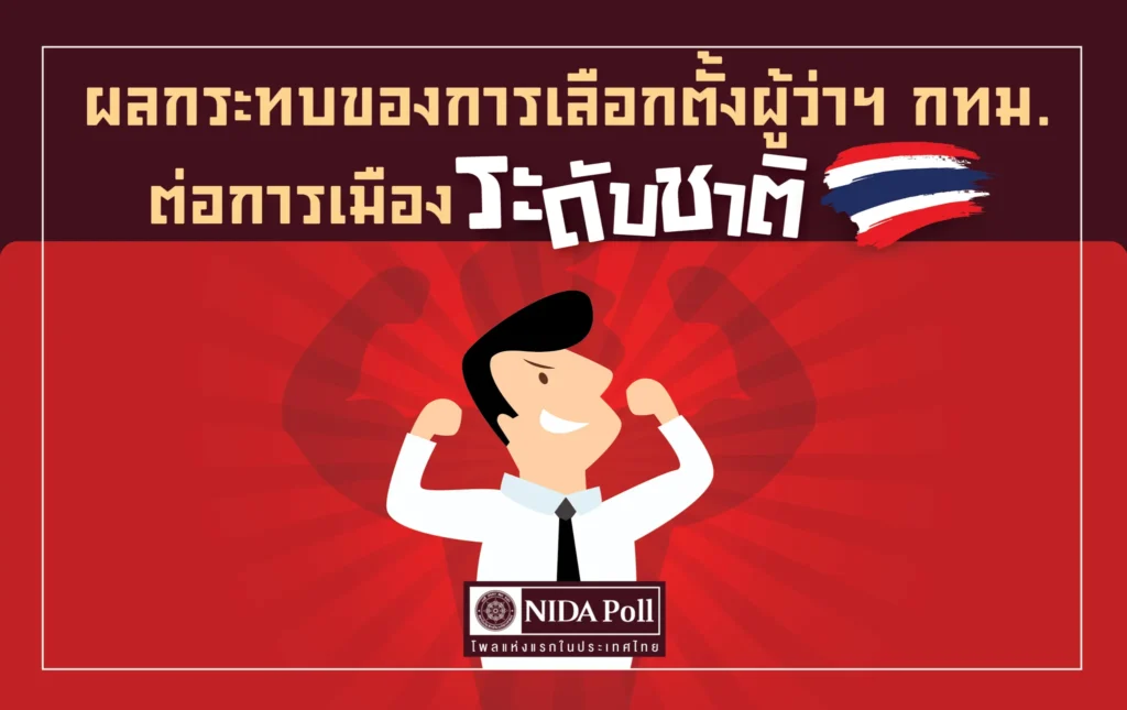 ของการเลือกตั้งผู้ว่าฯ กทม. ต่อการเมืองระดับชาติ ทำการสำรวจระหว่างวันที่ 25-27 พฤษภาคม 2565 จากประชาชนที่มีอายุ 18 ปีขึ้นไป กระจายทุกภูมิภาค ระดับการศึกษา อาชีพ และรายได้ ทั่วประเทศ รวมทั้งสิ้น จำนวน 1,322 หน่วยตัวอย่าง เกี่ยวกับผลกระทบของการเลือกตั้งผู้ว่าฯ กทม. ต่อการเมืองระดับชาติ การสำรวจอาศัยการสุ่มตัวอย่างโดยใช้ความน่าจะเป็นจากบัญชีรายชื่อฐานข้อมูลตัวอย่างหลัก (Master Sample) ของ นิด้าโพล สุ่มตัวอย่างด้วยวิธีแบบง่าย (Simple Random Sampling) เก็บข้อมูลด้วยวิธีการสัมภาษณ์ทางโทรศัพท์ โดยกำหนดค่าความเชื่อมั่น ร้อยละ 97.0