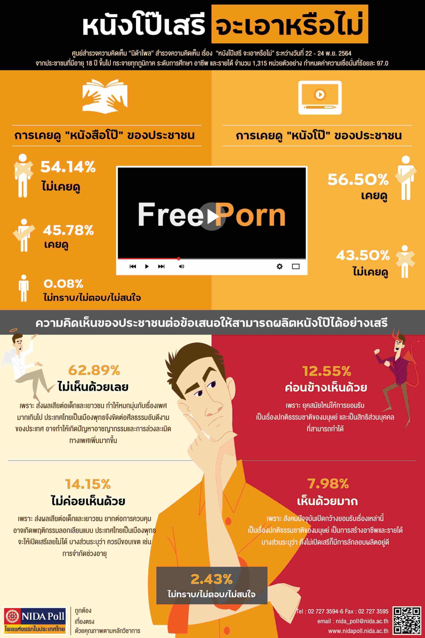 ท้ายที่สุดเมื่อถามถึงความคิดเห็นของประชาชนต่อข้อเสนอให้สามารถผลิตหนังโป๊ได้อย่างเสรี พบว่า ส่วนใหญ่ ร้อยละ 62.89 ระบุว่า ไม่เห็นด้วยเลยเพราะ ส่งผลเสียต่อเด็กและเยาวชน ทำให้หมกมุ่นกับเรื่องเพศมากจนเกินไป ประเทศไทยเป็นเมืองพุทธจึงขัดต่อศีลธรรมอันดีงามของประเทศ อาจทำให้เกิดปัญหาอาชญากรรม และการล่วงละเมิดทางเพศเพิ่มมากขึ้น รองลงมา ร้อยละ 14.15 ระบุว่า ไม่ค่อยเห็นด้วยเพราะ อาจส่งผลเสียต่อเด็กและเยาวชน ยากต่อการควบคุม อาจเกิดพฤติกรรมลอกเลียนแบบ ประเทศไทยเป็นเมืองพุทธจะให้เปิดเสรีเลยไม่ได้ ขณะที่บางส่วนระบุว่า ควรมีขอบเขต เช่น การจำกัดช่วงอายุ ร้อยละ 12.55 ระบุว่า ค่อนข้างเห็นด้วยเพราะ ยุคสมัยใหม่ให้การยอมรับเป็นเรื่องปกติธรรมชาติของมนุษย์ และเป็นสิทธิส่วนบุคคลที่สามารถทำได้ ร้อยละ 7.98 ระบุว่า เห็นด้วยมากเพราะ สังคมปัจจุบัน เปิดกว้างยอมรับเรื่องเหล่านี้ เป็นเรื่องปกติธรรมชาติของมนุษย์ เป็นการสร้างอาชีพและรายได้ ขณะที่บางส่วนระบุว่า ถึงไม่เปิดเสรีก็มีการลักลอบผลิตอยู่ดี และร้อยละ 2.43 ระบุว่า ไม่ทราบ/ไม่ตอบ/ไม่สนใจ