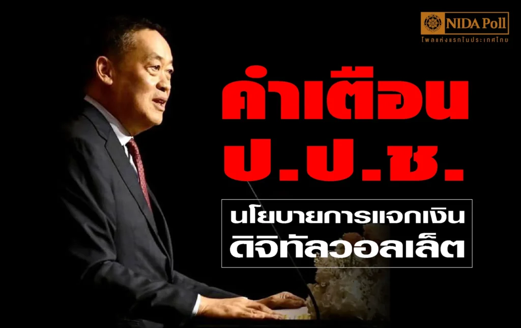ศูนย์สำรวจความคิดเห็น นิด้าโพล สถาบันบัณฑิตพัฒนบริหารศาสตร์ (นิด้า) เปิดเผยผลสำรวจของประชาชน เรื่อง คำเตือน ป.ป.ช. นโยบายการแจกเงินดิจิทัลวอลเล็ต ทำการสำรวจระหว่างวันที่ 8-12 กุมภาพันธ์ 2567 จากประชาชนที่มีอายุ 18 ปีขึ้นไป กระจายทุกภูมิภาค ระดับการศึกษา อาชีพ และรายได้ ทั่วประเทศ รวมทั้งสิ้น จำนวน 1,310 หน่วยตัวอย่าง เกี่ยวกับคำเตือนของ ป.ป.ช. ต่อนโยบายการแจกเงินดิจิทัล วอลเล็ต การสำรวจอาศัยการสุ่มตัวอย่าง โดยใช้ความน่าจะเป็นจากบัญชีรายชื่อฐานข้อมูลตัวอย่างหลัก (Master Sample) ของ นิด้าโพล สุ่มตัวอย่างแบบหลายขั้นตอน (Multi-stage Sampling) เก็บข้อมูลด้วยวิธีการสัมภาษณ์ทางโทรศัพท์ โดยกำหนดค่าความเชื่อมั่น ร้อยละ 97.0