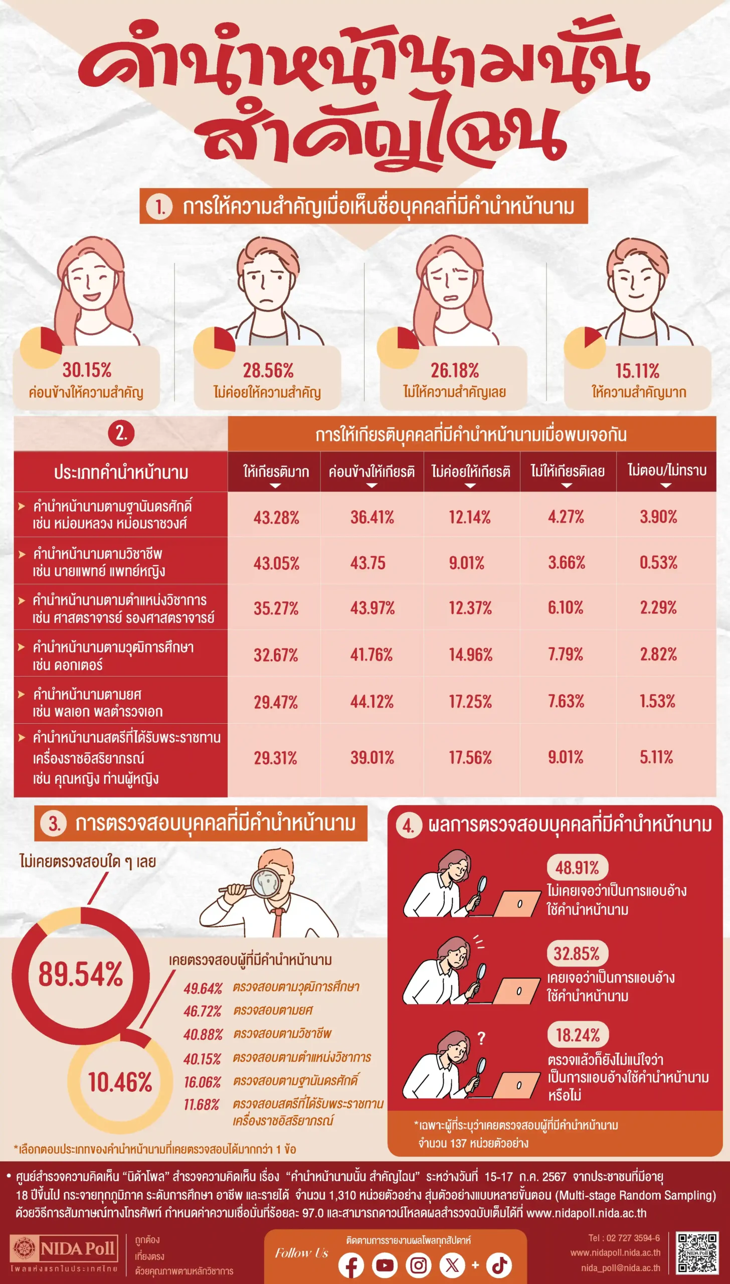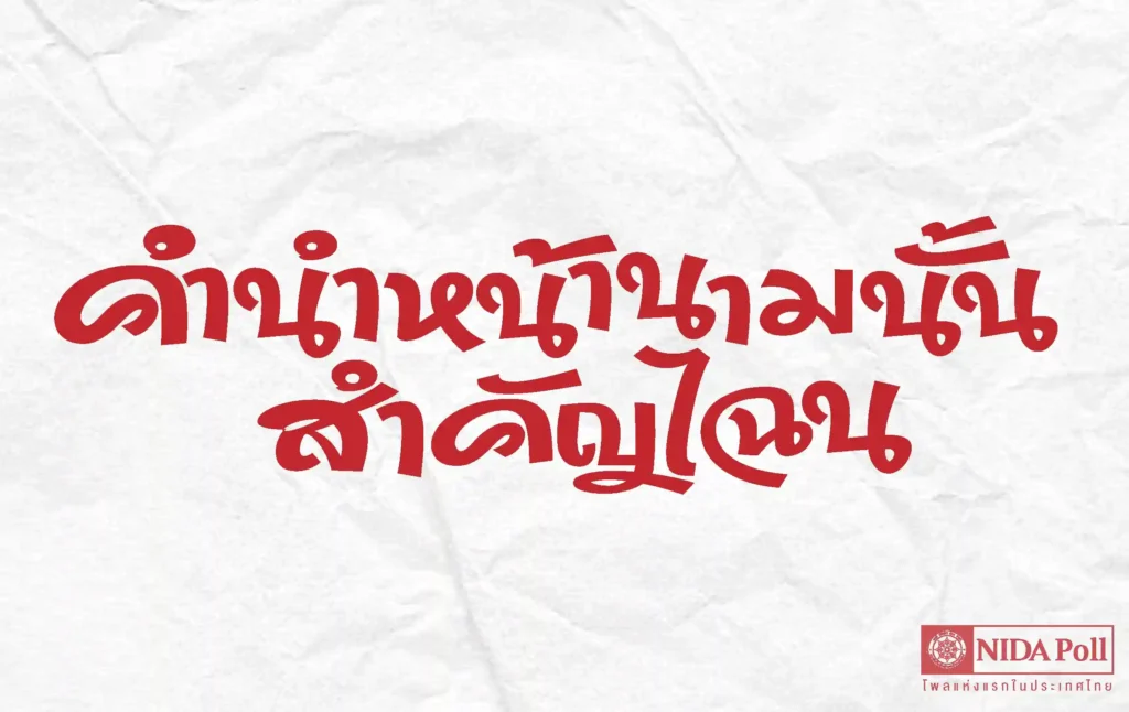 คำนำหน้านามนั้น สำคัญไฉน ทำการสำรวจระหว่างวันที่ 15-17 กรกฎาคม 2567 จากประชาชนที่มีอายุ 18 ปีขึ้นไป กระจายทุกภูมิภาคระดับการศึกษา อาชีพ และรายได้ ทั่วประเทศ รวมทั้งสิ้น จำนวน 1,310 หน่วยตัวอย่าง เกี่ยวกับการให้ความสำคัญกับคำนำหน้านาม การสำรวจอาศัยการสุ่มตัวอย่างโดยใช้ความน่าจะเป็นจากบัญชีรายชื่อฐานข้อมูลตัวอย่างหลัก (Master Sample) ของ นิด้าโพล สุ่มตัวอย่างแบบหลายขั้นตอน (Multi-stage Sampling) เก็บข้อมูลด้วยวิธีการสัมภาษณ์ทางโทรศัพท์ โดยกำหนดค่าความเชื่อมั่น ร้อยละ 97.0