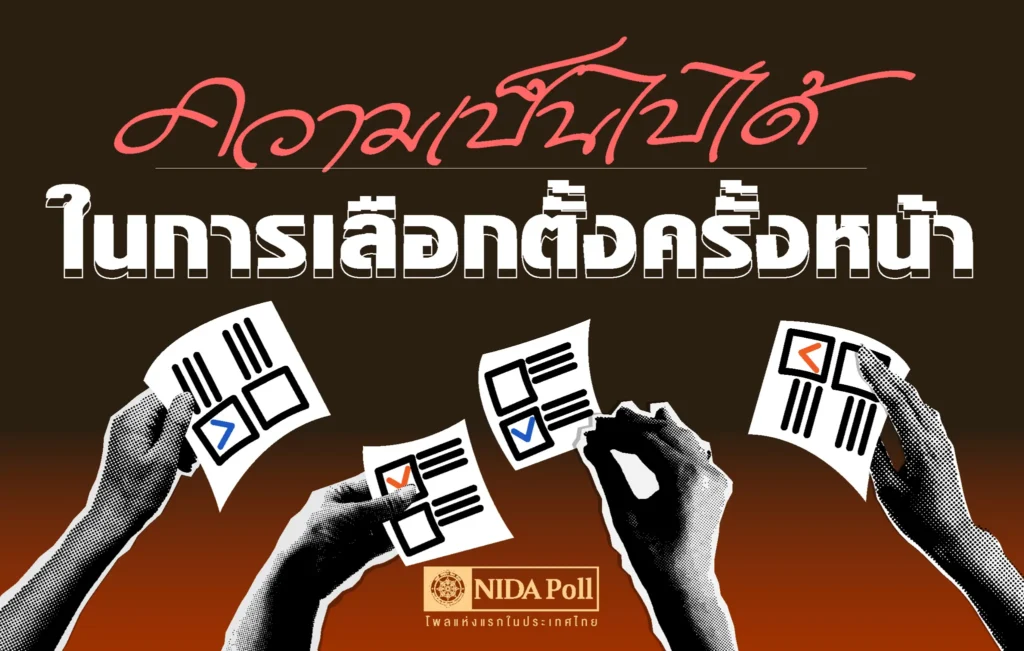 ศูนย์สำรวจความคิดเห็น นิด้าโพล สถาบันบัณฑิตพัฒนบริหารศาสตร์ (นิด้า) เปิดเผยผลการสำรวจของประชาชน เรื่อง ความเป็นไปได้ในการเลือกตั้งครั้งหน้า ทำการสำรวจระหว่างวันที่ 13-15 สิงหาคม 2567 จากประชาชนที่มีอายุ 18 ปีขึ้นไป กระจายทุกภูมิภาค ระดับการศึกษา อาชีพ และรายได้ ทั่วประเทศ รวมทั้งสิ้น จำนวน 1,310 หน่วยตัวอย่าง เกี่ยวกับความเป็นไปได้ทางการเมืองในการเลือกตั้งครั้งหน้า การสำรวจอาศัยการสุ่มตัวอย่างโดยใช้ความน่าจะเป็นจากบัญชีรายชื่อฐานข้อมูลตัวอย่างหลัก (Master Sample) ของ นิด้าโพล สุ่มตัวอย่างแบบหลายขั้นตอน (Multi-stage Sampling) เก็บข้อมูลด้วยวิธีการสัมภาษณ์ทางโทรศัพท์ โดยกำหนดค่าความเชื่อมั่น ร้อยละ 97.0