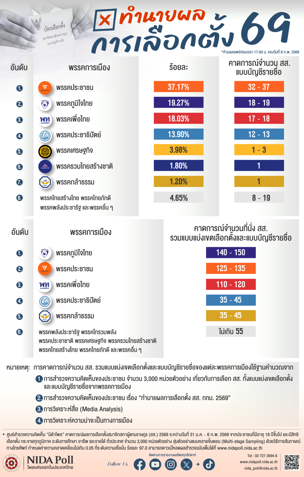 ศูนย์สำรวจความคิดเห็น “นิด้าโพล” สถาบันบัณฑิตพัฒนบริหารศาสตร์ (นิด้า) คาดการณ์ผลการเลือกตั้งสมาชิกสภาผู้แทนราษฎร (สส.) 2569 ประกอบด้วยวิธีการ คือ 1) เก็บข้อมูลด้วยวิธีการสัมภาษณ์ทางโทรศัพท์ โดยทำการสำรวจระหว่างวันที่ 31 มกราคม – 6 กุมภาพันธ์ 2569 จากประชาชนที่มีอายุ 18 ปีขึ้นไป และมีสิทธิเลือกตั้ง กระจายทุกภูมิภาค ระดับการศึกษา อาชีพ และรายได้ ทั่วประเทศ รวมจำนวนทั้งสิ้น 3,000 หน่วยตัวอย่าง