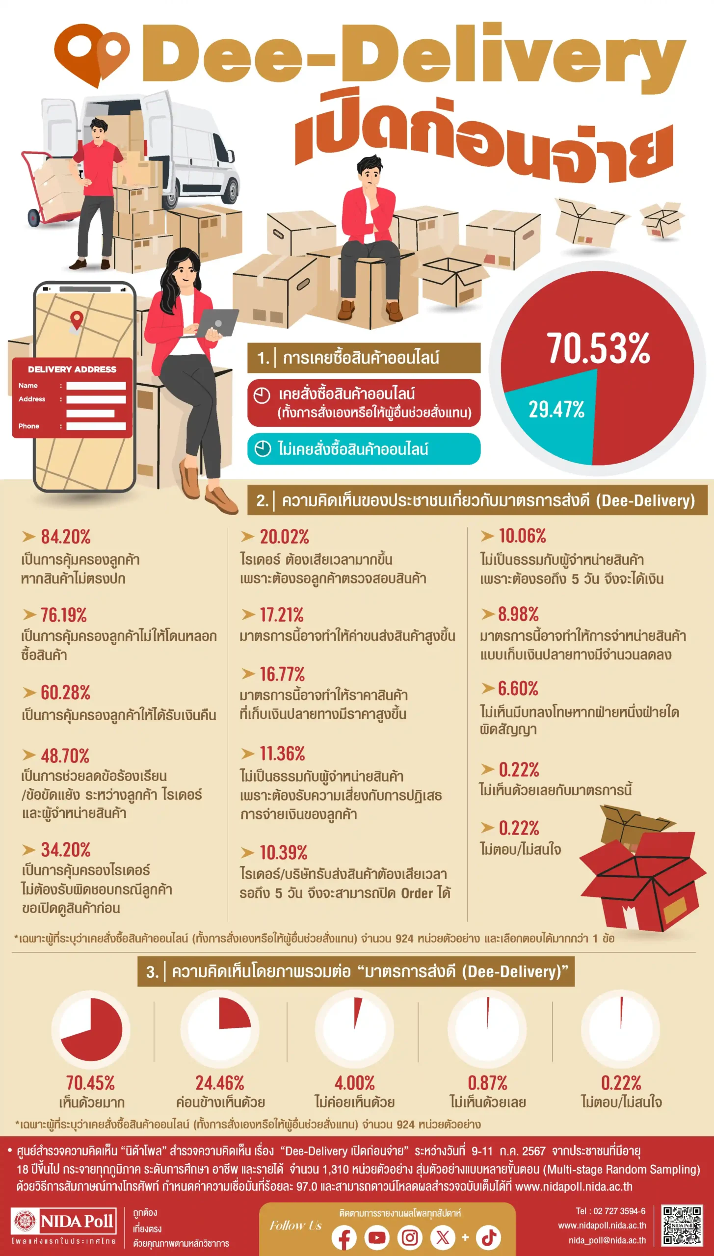 ศูนย์สำรวจความคิดเห็น นิด้าโพล สถาบันบัณฑิตพัฒนบริหารศาสตร์ (นิด้า) เปิดเผยผลการสำรวจของประชาชน เรื่อง Dee-Delivery เปิดก่อนจ่าย ทำการสำรวจระหว่างวันที่ 9-11 กรกฎาคม 2567 จากประชาชนที่มีอายุ 18 ปีขึ้นไป กระจายทุกภูมิภาค ระดับการศึกษา อาชีพและรายได้ ทั่วประเทศ รวมทั้งสิ้น จำนวน 1,310 หน่วยตัวอย่าง เกี่ยวกับมาตรการส่งดี (Dee-Delivery) เพื่อแก้ไขปัญหากลโกงหลอกเก็บเงินปลายทาง และการขายสินค้าไม่ตรงปก การสำรวจอาศัยการสุ่มตัวอย่างโดยใช้ความน่าจะเป็นจากบัญชีรายชื่อฐานข้อมูลตัวอย่างหลัก (Master Sample) ของ นิด้าโพล สุ่มตัวอย่างแบบหลายขั้นตอน (Multi-stage Sampling) เก็บข้อมูลด้วยวิธีการสัมภาษณ์ทางโทรศัพท์ โดยกำหนดค่าความเชื่อมั่น ร้อยละ 97.0