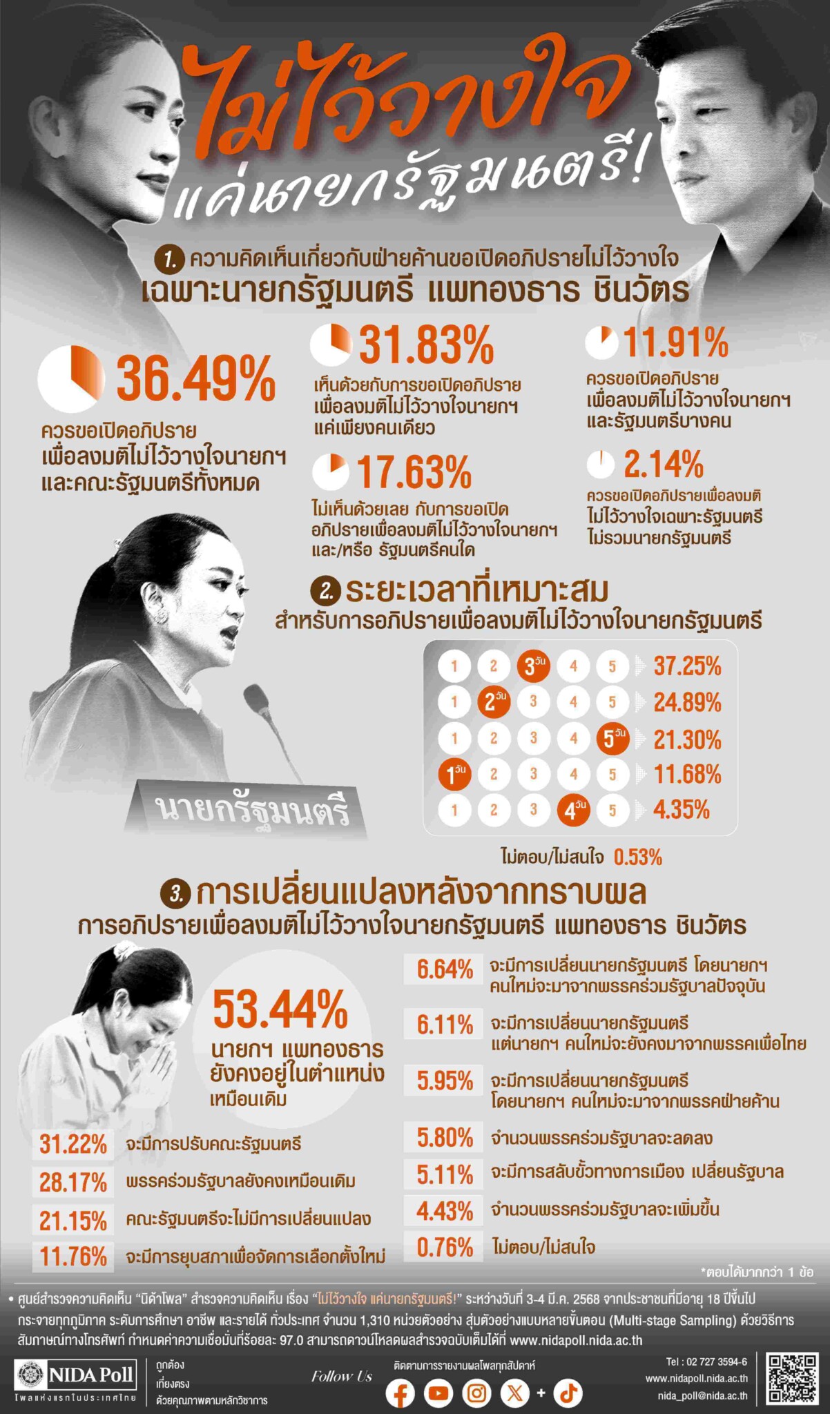 ศูนย์สำรวจความคิดเห็น “นิด้าโพล” สถาบันบัณฑิตพัฒนบริหารศาสตร์ (นิด้า) เปิดเผยผลการสำรวจ เรื่อง “ไม่ไว้วางใจแค่นายกรัฐมนตรี !” ทำการสำรวจระหว่างวันที่ 3-4 มีนาคม 2568 จากประชาชนที่มีอายุ 18 ปีขึ้นไป กระจายทุกภูมิภาค ระดับการศึกษา อาชีพ และรายได้ ทั่วประเทศ รวมจำนวนทั้งสิ้น 1,310 หน่วยตัวอย่าง เกี่ยวกับการเปิดอภิปรายไม่ไว้วางใจเฉพาะนายกรัฐมนตรี แพทองธาร ชินวัตร การสำรวจอาศัยการสุ่มตัวอย่างโดยใช้ความน่าจะเป็นจากบัญชีรายชื่อฐานข้อมูลตัวอย่างหลัก (Master Sample) ของ “นิด้าโพล” สุ่มตัวอย่างแบบหลายขั้นตอน (Multi-stage Sampling) เก็บข้อมูลด้วยวิธีการสัมภาษณ์ทางโทรศัพท์ โดยกำหนดค่าความเชื่อมั่น ร้อยละ 97.0
