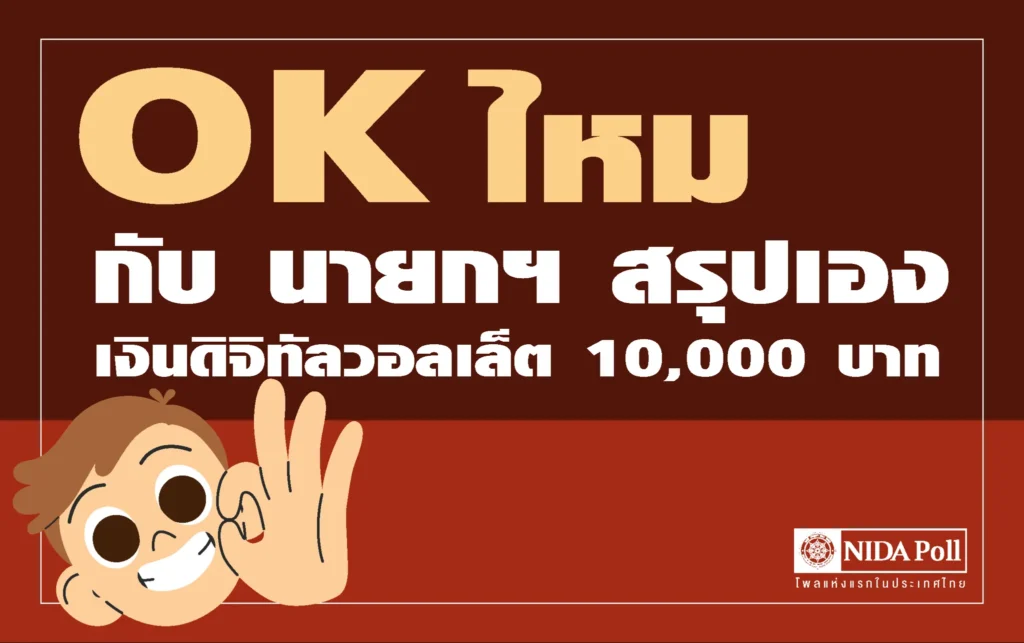 ศูนย์สำรวจความคิดเห็น นิด้าโพล สถาบันบัณฑิตพัฒนบริหารศาสตร์ (นิด้า) เปิดเผยผลสำรวจของประชาชน เรื่อง OK ไหม กับ นายกฯ สรุปเอง เงินดิจิทัลวอลเล็ต 10,000 บาท ทำการสำรวจระหว่างวันที่ 13-16 พฤศจิกายน 2566 จากประชาชนที่มีอายุ 18 ปีขึ้นไป กระจายทุกภูมิภาค ระดับการศึกษา อาชีพ และรายได้ ทั่วประเทศ รวมทั้งสิ้น จำนวน 1,310 หน่วยตัวอย่าง เกี่ยวกับบทสรุปของนโยบายเงินดิจิทัลวอลเล็ต 10,000 บาท ภายหลังการแถลงของนายกรัฐมนตรีเศรษฐา ทวีสิน การสำรวจอาศัยการสุ่มตัวอย่างโดยใช้ความน่าจะเป็นจากบัญชีรายชื่อฐานข้อมูลตัวอย่างหลัก (Master Sample) ของ นิด้าโพล สุ่มตัวอย่างแบบหลายขั้นตอน (Multi-stage Sampling) เก็บข้อมูลด้วยวิธีการสัมภาษณ์ทางโทรศัพท์ โดยกำหนด