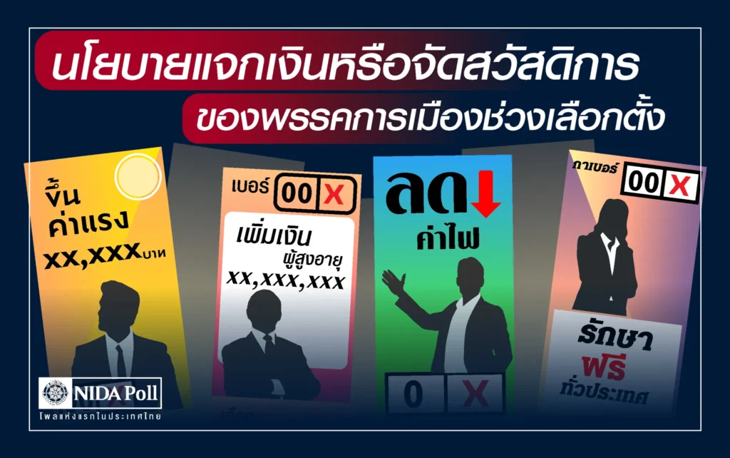 ศูนย์สำรวจความคิดเห็น นิด้าโพล สถาบันบัณฑิตพัฒนบริหารศาสตร์ (นิด้า) ร่วมกับเครือข่ายการเมืองสะอาดเปิดเผยผลสำรวจ ของประชาชน เรื่อง นโยบายแจกเงินหรือจัดสวัสดิการของพรรคการเมืองช่วงเลือกตั้ง ทำการสำรวจระหว่างวันที่ 20-24 เมษายน 2566 จากประชาชนที่มีอายุ 18 ปีขึ้นไป กระจายทุกภูมิภาค ระดับการศึกษา อาชีพ และรายได้ ทั่วประเทศ รวมทั้งสิ้น จำนวน 1,310 หน่วยตัวอย่าง เกี่ยวกับนโยบายแจกเงินหรือจัดสวัสดิการของพรรคการเมืองช่วงเลือกตั้ง การสำรวจอาศัยการสุ่มตัวอย่างโดยใช้ความน่าจะเป็นจากบัญชีรายชื่อฐานข้อมูลตัวอย่างหลัก (Master Sample) ของ นิด้าโพล สุ่มตัวอย่างด้วยวิธีแบบง่าย (Simple Random Sampling) เก็บข้อมูลด้วยวิธีการสัมภาษณ์ทางโทรศัพท์ โดยกำหนดค่าความเชื่อมั่น ร้อยละ 97.0