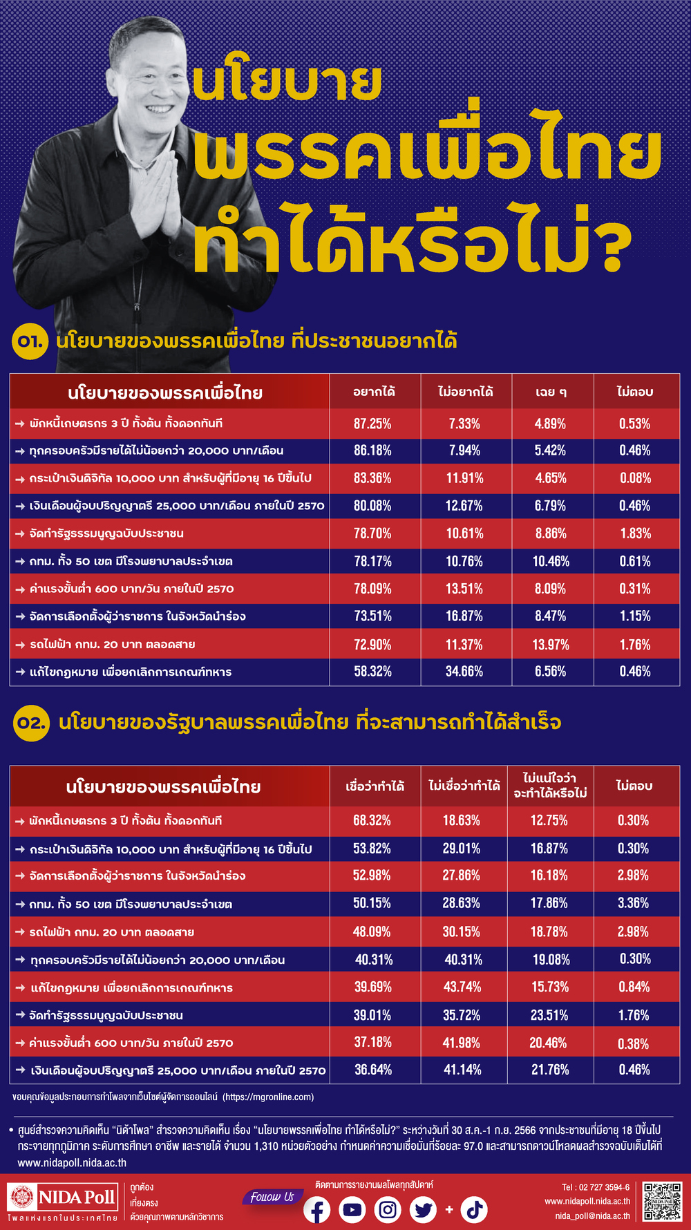 ศูนย์สำรวจความคิดเห็น “นิด้าโพล” สถาบันบัณฑิตพัฒนบริหารศาสตร์ (นิด้า) เปิดเผยผลสำรวจของประชาชน เรื่อง “นโยบายพรรคเพื่อไทย ทำได้หรือไม่?” ทำการสำรวจระหว่างวันที่ 30 สิงหาคม ถึง วันที่ 1 กันยายน 2566 จากประชาชนที่มีอายุ 18 ปีขึ้นไป กระจายทุกภูมิภาค ระดับการศึกษา อาชีพ และรายได้ ทั่วประเทศ รวมทั้งสิ้น จำนวน 1,310 หน่วยตัวอย่าง เกี่ยวกับนโยบายของพรรคเพื่อไทย การสำรวจอาศัยการสุ่มตัวอย่างโดยใช้ความน่าจะเป็นจากบัญชีรายชื่อฐานข้อมูลตัวอย่างหลัก (Master Sample) ของ “นิด้าโพล” สุ่มตัวอย่างด้วยวิธีแบบง่าย (Simple Random Sampling) เก็บข้อมูลด้วยวิธีการสัมภาษณ์ทางโทรศัพท์ โดยกำหนดค่าความเชื่อมั่น ร้อยละ 97.0