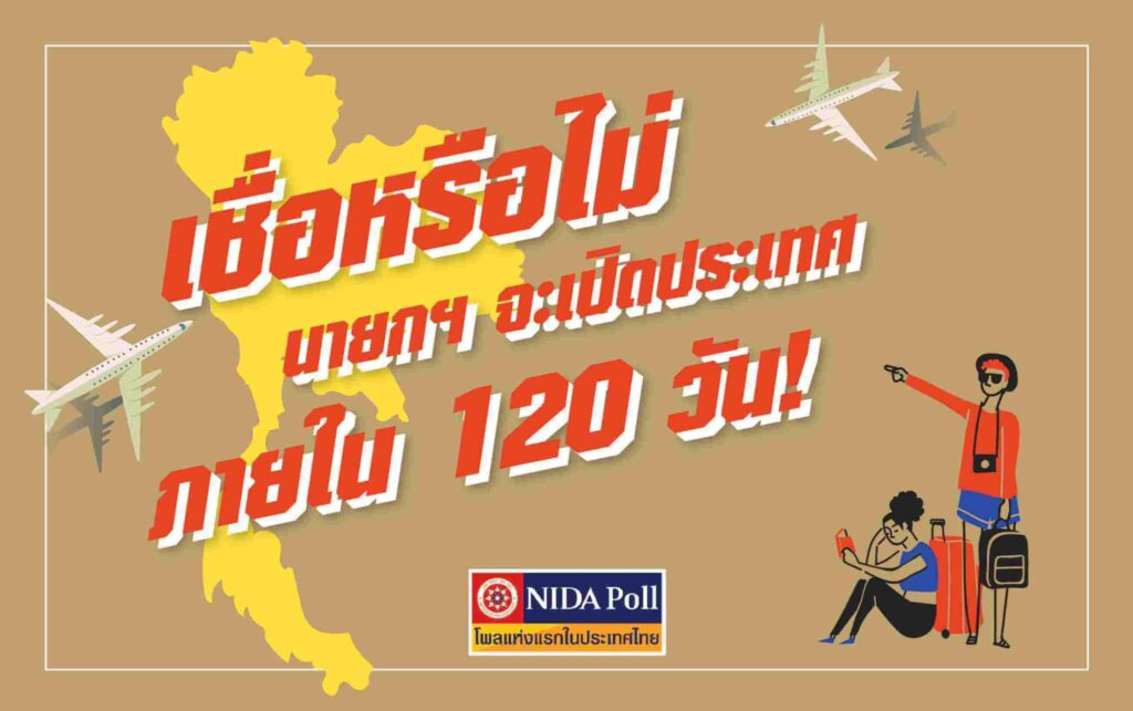 ศูนย์สำรวจความคิดเห็น “นิด้าโพล” สถาบันบัณฑิตพัฒนบริหารศาสตร์ (นิด้า) เปิดเผยผลสำรวจของประชาชน เรื่อง “เชื่อหรือไม่นายกฯจะเปิดประเทศภายใน 120 วัน ” ทำการสำรวจระหว่างวันที่ 22 – 25 มิถุนายน 2564 จากประชาชนที่มีอายุ 15 ปีขึ้นไป กระจายทุกภูมิภาค ระดับการศึกษา และอาชีพทั่วประเทศ รวมทั้งสิ้น จำนวน 1,311 หน่วยตัวอย่าง เกี่ยวกับคำประกาศของนายกรัฐมนตรี พลเอกประยุทธ์ จันทร์โอชา ที่จะต้องเปิดทั้งประเทศ ให้ได้ภายใน 120 วัน การสำรวจอาศัยการสุ่มตัวอย่างโดยใช้ความน่าจะเป็นจากบัญชีรายชื่อฐานข้อมูลตัวอย่างหลัก (Master Sample) ของ “นิด้าโพล” สุ่มตัวอย่าง ด้วยวิธีแบบง่าย (Simple Random Sampling) เก็บข้อมูลด้วยวิธีการสัมภาษณ์ทางโทรศัพท์ โดยกำหนดค่าความเชื่อมั่นที่ร้อยละ 97.0