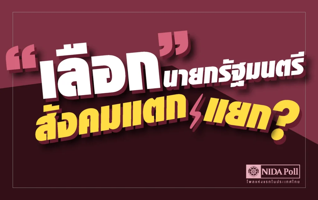 ศูนย์สำรวจความคิดเห็น นิด้าโพล สถาบันบัณฑิตพัฒนบริหารศาสตร์ (นิด้า) เปิดเผยผลสำรวจของประชาชน เรื่อง เลือกนายกรัฐมนตรี สังคมแตกแยก? ทำการสำรวจระหว่างวันที่ 11-12 กรกฎาคม 2566 จากประชาชนที่มีอายุ 18 ปีขึ้นไป กระจายทุกภูมิภาค ระดับการศึกษา อาชีพและรายได้ทั่วประเทศ รวมทั้งสิ้น จำนวน 1,310 หน่วยตัวอย่าง เกี่ยวกับการเลือกนายกรัฐมนตรีทำให้เกิดความแตกแยกในสังคมไทย หรือไม่การสำรวจอาศัยการสุ่มตัวอย่างโดยใช้ความน่าจะเป็นจากบัญชีรายชื่อฐานข้อมูลตัวอย่างหลัก (Master Sample) ของ นิด้าโพล สุ่มตัวอย่างด้วยวิธีแบบง่าย (Simple Random Sampling) เก็บข้อมูลด้วยวิธีการสัมภาษณ์ทางโทรศัพท์ โดยกำหนดค่าความเชื่อมั่น ร้อยละ 97.0