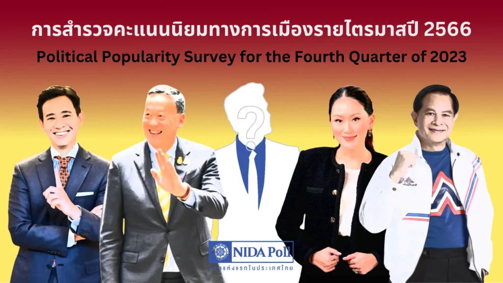 ศูนย์สำรวจความคิดเห็น นิด้าโพล สถาบันบัณฑิตพัฒนบริหารศาสตร์ (นิด้า) เปิดเผยผลสำรวจของประชาชน เรื่อง การสำรวจคะแนนนิยมทางการเมืองรายไตรมาสปี 2566 ทำการสำรวจระหว่างวันที่ 13-18 ธันวาคม 2566 จากประชาชนที่มีอายุ 18 ปีขึ้นไป กระจายทุกภูมิภาคระดับการศึกษา อาชีพ และรายได้ทั่วประเทศ รวมทั้งสิ้น จำนวน 2,000 หน่วยตัวอย่าง เกี่ยวกับคะแนนนิยมทางการเมือง การสำรวจอาศัยการสุ่มตัวอย่างโดยใช้ความน่าจะเป็นจากบัญชีรายชื่อฐานข้อมูลตัวอย่างหลัก (Master Sample) ของ นิด้าโพล สุ่มตัวอย่างแบบหลายขั้นตอน (Multi-stage Sampling) เก็บข้อมูลด้วยวิธีการสัมภาษณ์ทางโทรศัพท์ โดยกำหนดค่าความเชื่อมั่น ร้อยละ 97.0