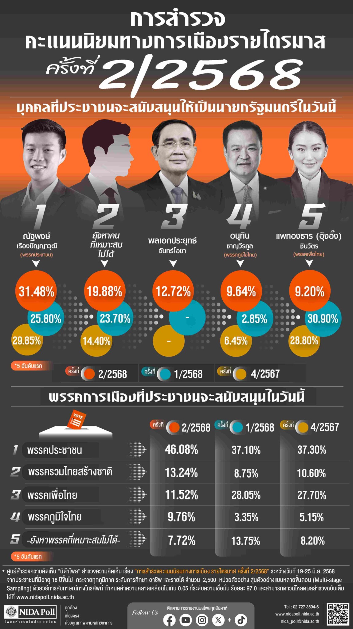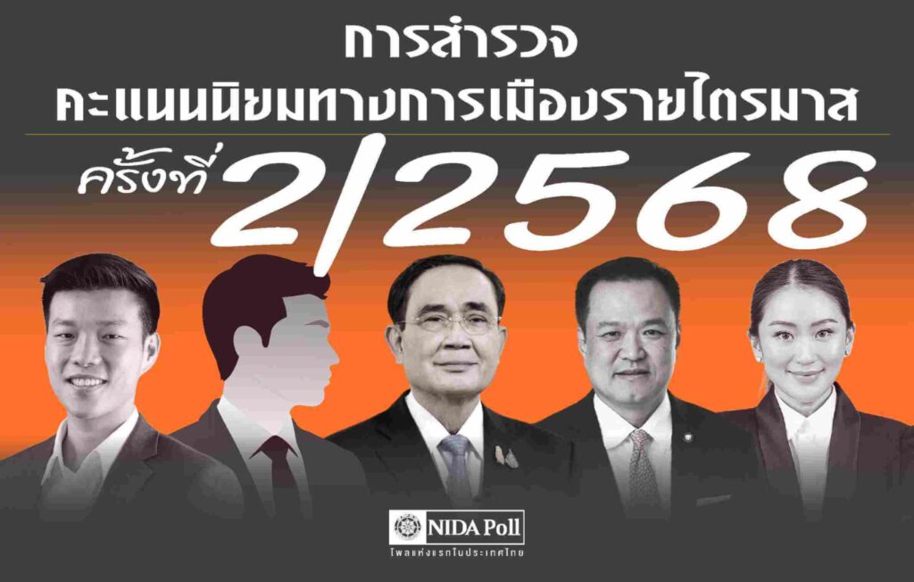ศูนย์สำรวจความคิดเห็น “นิด้าโพล” สถาบันบัณฑิตพัฒนบริหารศาสตร์ (นิด้า) เปิดเผยผลการสำรวจ เรื่อง “การสำรวจคะแนนนิยมทางการเมืองรายไตรมาสครั้งที่ 2/2568” ทำการสำรวจระหว่างวันที่ 19-25 มิถุนายน 2568 จากประชาชนที่มีอายุ 18 ปีขึ้นไป กระจายทุกภูมิภาค ระดับการศึกษา อาชีพ และรายได้ ทั่วประเทศ รวมจำนวนทั้งสิ้น 2,500 หน่วยตัวอย่าง เกี่ยวกับคะแนนนิยมทางการเมือง การสำรวจอาศัยการสุ่มตัวอย่างโดยใช้ความน่าจะเป็นจากบัญชีรายชื่อฐานข้อมูลตัวอย่างหลัก (Master Sample) ของ “นิด้าโพล” สุ่มตัวอย่างแบบหลายขั้นตอน (Multi-stage Sampling) เก็บข้อมูลด้วยวิธีการสัมภาษณ์ทางโทรศัพท์ โดยกำหนดค่าความคลาดเคลื่อนไม่เกิน 0.05 ที่ระดับความเชื่อมั่น ร้อยละ 97.0