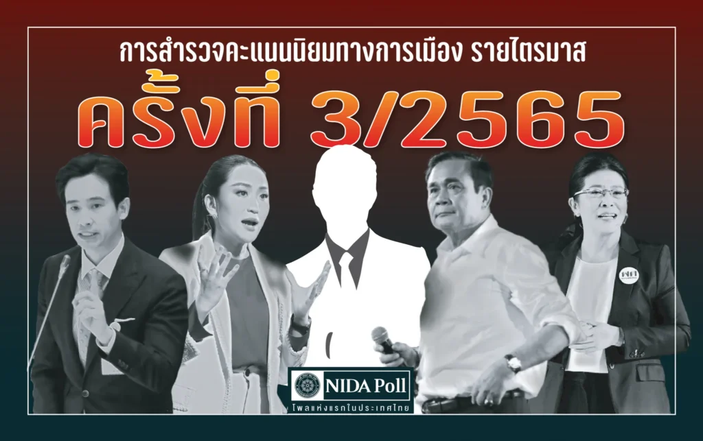 ศูนย์สำรวจความคิดเห็น นิด้าโพล สถาบันบัณฑิตพัฒนบริหารศาสตร์ (นิด้า) เปิดเผยผลสำรวจของประชาชน เรื่อง การสำรวจคะแนนนิยมทางการเมือง รายไตรมาส ครั้งที่ 3/2565 ทำการสำรวจระหว่างวันที่ 15–21 กันยายน 2565 จากประชาชนที่มีอายุ 18 ปีขึ้นไป กระจายทุกภูมิภาค ระดับการศึกษา อาชีพ และรายได้ทั่วประเทศ รวมจำนวน 2,500 หน่วยตัวอย่าง เกี่ยวกับ คะแนนนิยมทางการเมือง การสำรวจอาศัยการสุ่มตัวอย่างโดยใช้ความน่าจะเป็นจากบัญชีรายชื่อฐานข้อมูลตัวอย่างหลัก (Master Sample) ของ นิด้าโพล สุ่มตัวอย่างแบบง่าย (Simple Random Sampling) เก็บข้อมูลด้วยการสัมภาษณ์ทางโทรศัพท์ โดยกำหนดค่าความเชื่อมั่น ร้อยละ 97.0