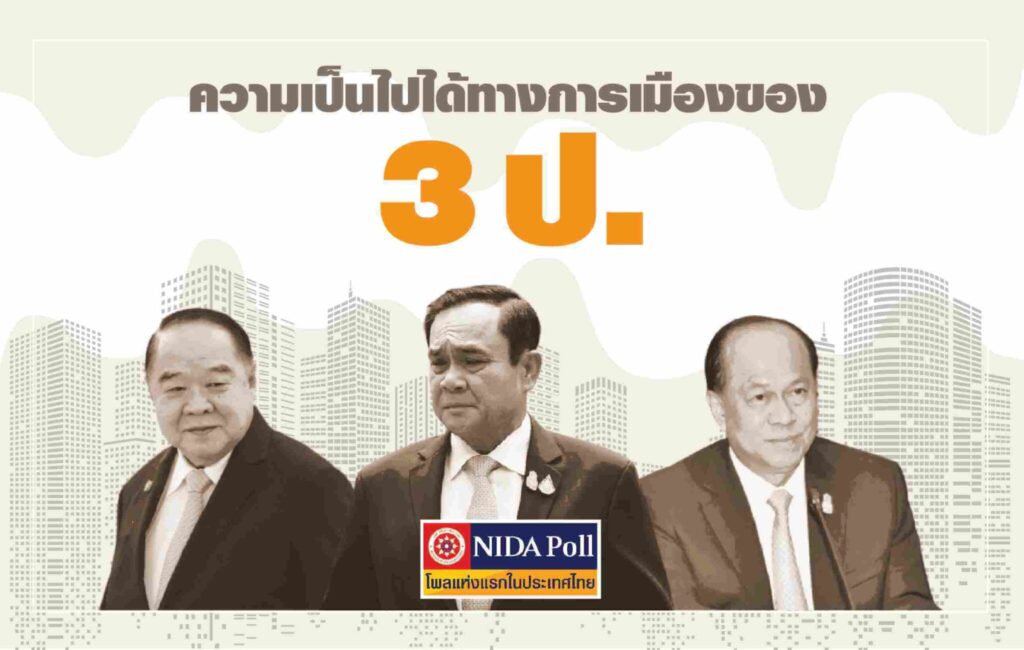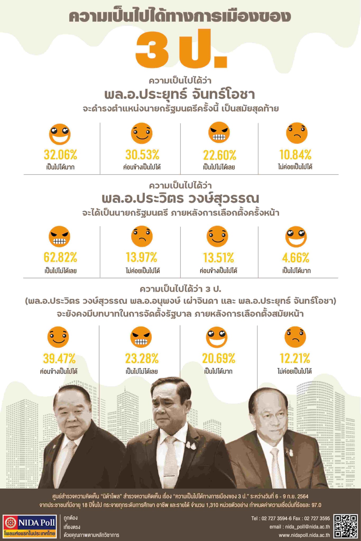 ศูนย์สำรวจความคิดเห็น “นิด้าโพล” สถาบันบัณฑิตพัฒนบริหารศาสตร์ (นิด้า) เปิดเผยผลสำรวจของประชาชน เรื่อง “ความเป็นไปได้ทางการเมืองของ 3 ป.” ทำการสำรวจระหว่างวันที่ 6 – 9 กันยายน 2564 จากประชาชนที่มีอายุ 18 ปีขึ้นไป กระจายทุกภูมิภาค ระดับการศึกษา และอาชีพทั่วประเทศ รวมทั้งสิ้น จำนวน 1,310 หน่วยตัวอย่าง เกี่ยวกับความเป็นไปได้ทางการเมืองของ 3 ป. (พล.อ.ประวิตร วงษ์สุวรรณ พล.อ.อนุพงษ์ เผ่าจินดา และพล.อ.ประยุทธ์ จันทร์โอชา) การสำรวจอาศัยการสุ่มตัวอย่างโดยใช้ความน่าจะเป็นจากบัญชีรายชื่อฐานข้อมูลตัวอย่างหลัก (Master Sample) ของ “นิด้าโพล” สุ่มตัวอย่างด้วยวิธีแบบง่าย (Simple Random Sampling) เก็บข้อมูลด้วยวิธีการสัมภาษณ์ทางโทรศัพท์ โดยกำหนดค่าความเชื่อมั่นที่ร้อยละ 97.0