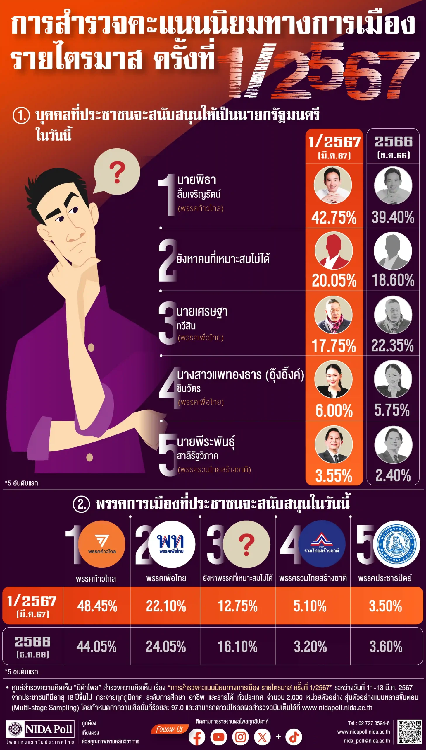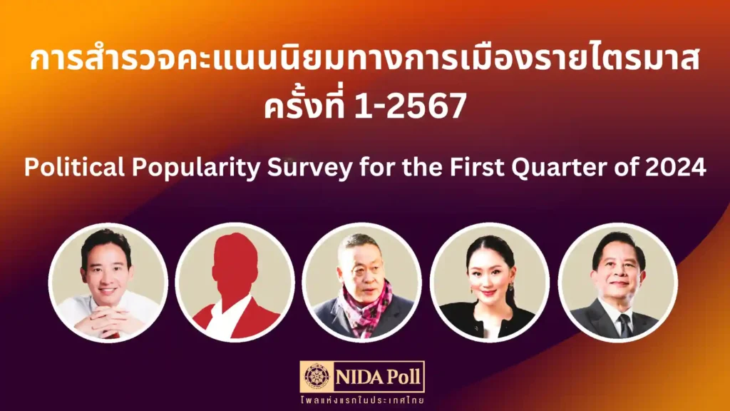 ศูนย์สำรวจความคิดเห็น นิด้าโพล สถาบันบัณฑิตพัฒนบริหารศาสตร์ (นิด้า) เปิดเผยผลการสำรวจของประชาชน เรื่อง การสำรวจคะแนนนิยมทางการเมือง รายไตรมาส ครั้งที่ 1/2567 ทำการสำรวจระหว่างวันที่ 11-13 มีนาคม 2567 จากประชาชนที่มีอายุ 18 ปีขึ้นไป กระจายทุกภูมิภาค ระดับการศึกษา อาชีพ และรายได้ ทั่วประเทศ รวมทั้งสิ้น จำนวน 2,000 หน่วยตัวอย่าง เกี่ยวกับคะแนนนิยมทางการเมืองการสำรวจอาศัยการสุ่มตัวอย่างโดยใช้ความน่าจะเป็นจากบัญชีรายชื่อฐานข้อมูลตัวอย่างหลัก (Master Sample) ของ นิด้าโพล สุ่มตัวอย่างแบบหลายขั้นตอน (Multi-stage Sampling) เก็บข้อมูลด้วยวิธีการสัมภาษณ์ทางโทรศัพท์ โดยกำหนดค่าความเชื่อมั่น ร้อยละ 97.0