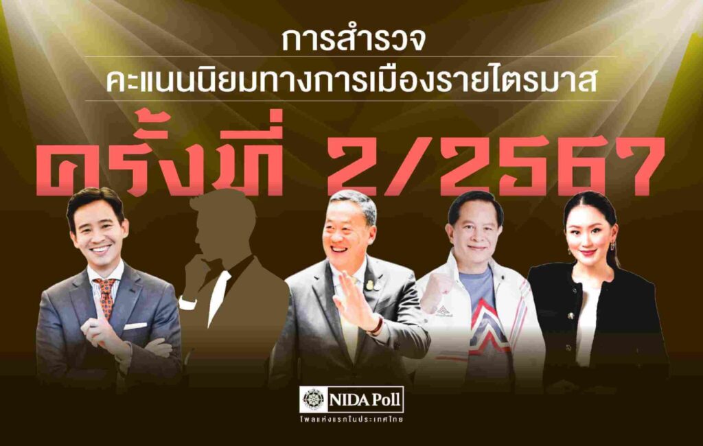 ศูนย์สำรวจความคิดเห็น นิด้าโพล สถาบันบัณฑิตพัฒนบริหารศาสตร์ (นิด้า) เปิดเผยผลการสำรวจของประชาชน เรื่อง การสำรวจคะแนนนิยมทางการเมือง รายไตรมาส ครั้งที่ 2/2567 ทำการสำรวจระหว่างวันที่ 14-18 มิถุนายน 2567 จากประชาชนที่มีอายุ 18 ปีขึ้นไป กระจายทุกภูมิภาค ระดับการศึกษา อาชีพ และรายได้ ทั่วประเทศ รวมทั้งสิ้น จำนวน 2,000 หน่วยตัวอย่าง เกี่ยวกับคะแนนนิยมทางการเมือง การสำรวจอาศัยการสุ่มตัวอย่างโดยใช้ความน่าจะเป็นจากบัญชีรายชื่อฐานข้อมูลตัวอย่างหลัก (Master Sample) ของ นิด้าโพล สุ่มตัวอย่าง แบบหลายขั้นตอน (Multi-stage Sampling) เก็บข้อมูลด้วยวิธีการสัมภาษณ์ทางโทรศัพท์ โดยกำหนดค่าความเชื่อมั่น ร้อยละ 97.0
