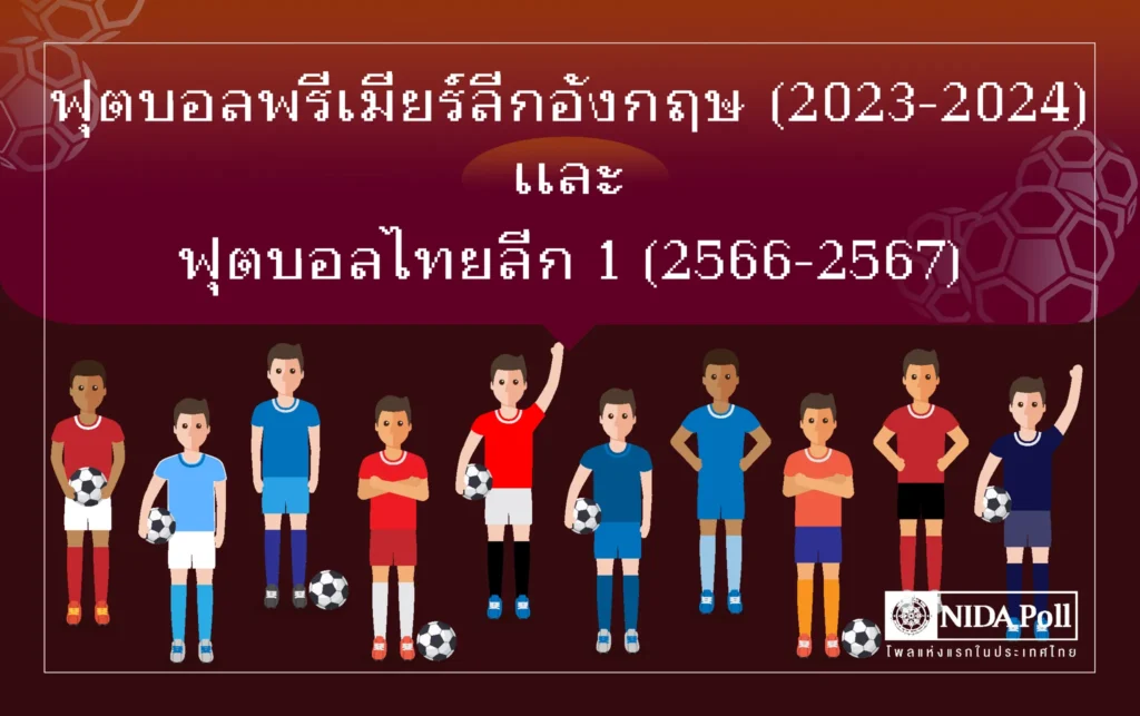 ศูนย์สำรวจความคิดเห็น นิด้าโพล สถาบันบัณฑิตพัฒนบริหารศาสตร์ (นิด้า) เปิดเผยผลสำรวจความคิดเห็นของประชาชน เรื่อง ฟุตบอลพรีเมียร์ลีกอังกฤษ (2023-2024) และฟุตบอลไทยลีก 1 (2566-2567) ทำการสำรวจระหว่างวันที่ 13-19 กรกฎาคม 2566 จากประชาชนที่มีอายุ 15 ปีขึ้นไป กระจายทุกภูมิภาค ระดับการศึกษา อาชีพ และรายได้ทั่วประเทศ รวมทั้งสิ้น จำนวน 2,500 หน่วยตัวอย่าง เกี่ยวกับการติดตามฟุตบอลพรีเมียร์ลีกอังกฤษ ในฤดูกาล 2023-2024 และฟุตบอลไทยลีก 1 ในฤดูกาล 2566-2567 การสำรวจอาศัยการสุ่มตัวอย่างโดยใช้ความน่าจะเป็นจากบัญชีรายชื่อฐานข้อมูลตัวอย่างหลัก (Master Sample) ของ นิด้าโพล สุ่มตัวอย่างด้วยวิธีแบบง่าย (Simple Random Sampling) เก็บข้อมูลด้วยวิธีการสัมภาษณ์ทางโทรศัพท์ โดยกำหนดค่าความเชื่อมั่น ร้อยละ 97.0
