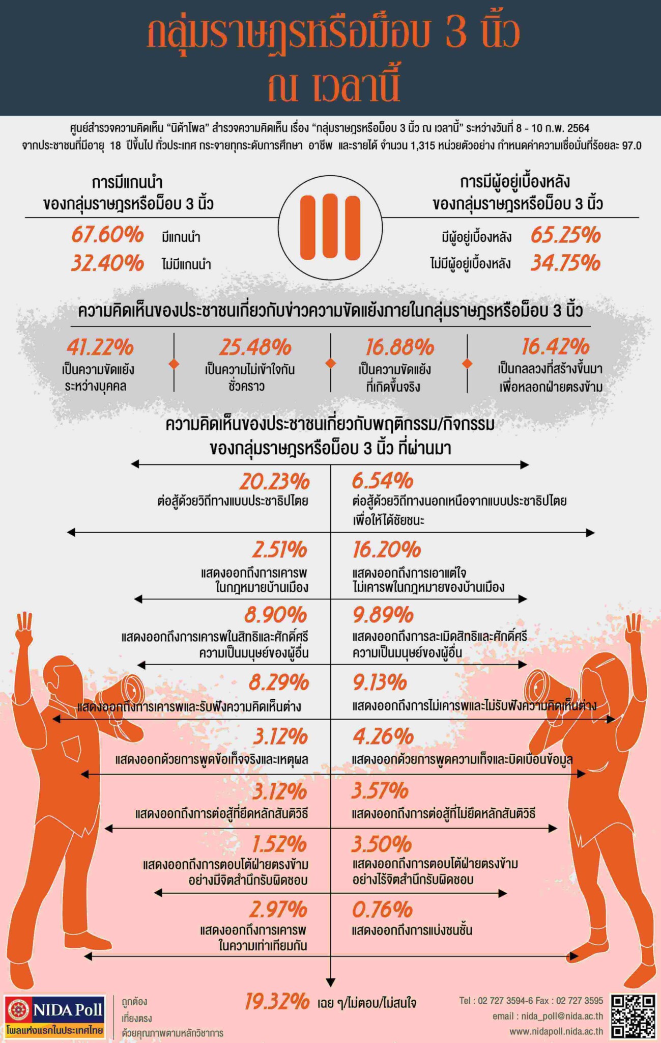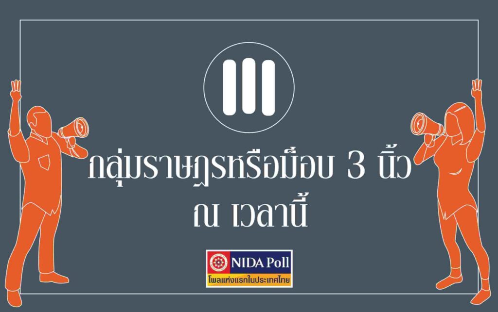 ศูนย์สำรวจความคิดเห็น “นิด้าโพล” สถาบันบัณฑิตพัฒนบริหารศาสตร์ (นิด้า) เปิดเผยผลสำรวจของประชาชน เรื่อง “กลุ่มราษฎร หรือม็อบสามนิ้วณเวลานี้” ทำการสำรวจระหว่างวันที่ 8 – 10 กุมภาพันธ์ 2564 จากประชาชนที่มีอายุ 18 ปีขึ้นไป กระจายทุกภูมิภาค ระดับการศึกษา และอาชีพทั่วประเทศ รวมทั้งสิ้น จำนวน 1,315 หน่วยตัวอย่าง เกี่ยวกับกลุ่มราษฎรหรือม็อบสามนิ้ว ณ เวลานี้ การสำรวจอาศัยการสุ่มตัวอย่างโดยใช้ความน่าจะเป็นจากบัญชีรายชื่อฐานข้อมูลตัวอย่างหลัก (Master Sample) ของ “นิด้าโพล” สุ่มตัวอย่างด้วยวิธีแบบง่าย (Simple Random Sampling) เก็บข้อมูลด้วยวิธีการสัมภาษณ์ทางโทรศัพท์โดยกำหนดค่าความเชื่อมั่นที่ร้อยละ 97.0