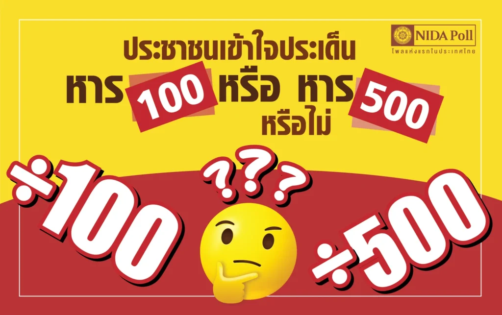ศูนย์สำรวจความคิดเห็น นิด้าโพล สถาบันบัณฑิตพัฒนบริหารศาสตร์ (นิด้า) เปิดเผยผลสำรวจของประชาชน เรื่อง ประชาชนเข้าใจประเด็นหาร 100 หรือหาร 500 หรือไม่ ทำการสำรวจระหว่างวันที่ 11–13 กรกฎาคม 2565 จากประชาชนที่มีอายุ 18 ปีขึ้นไป กระจายทุกภูมิภาค ระดับการศึกษา อาชีพ และรายได้ทั่วประเทศ รวมทั้งสิ้น 1,312 หน่วยตัวอย่าง เกี่ยวกับความเข้าใจต่อร่างกฎหมายการเลือกตั้ง ส.ส. ในประเด็นสูตรคำนวณ ส.ส. บัญชีรายชื่อ หาร 100 หรือ หาร 500 การสำรวจอาศัยการสุ่มตัวอย่างโดยใช้ความน่าจะเป็นจากบัญชีรายชื่อฐานข้อมูลตัวอย่างหลัก (Master Sample) ของ นิด้าโพล สุ่มตัวอย่างด้วยวิธีแบบง่าย (Simple Random Sampling) เก็บข้อมูลด้วยวิธีการสัมภาษณ์ทางโทรศัพท์ โดยกำหนดค่าความเชื่อมั่น ร้อยละ 97.0