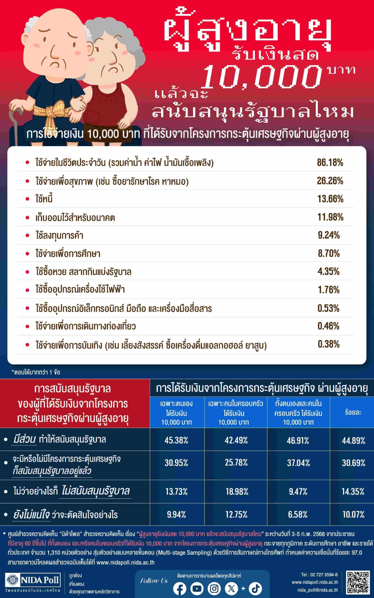 ศูนย์สำรวจความคิดเห็น “นิด้าโพล” สถาบันบัณฑิตพัฒนบริหารศาสตร์ (นิด้า) เปิดเผยผลการสำรวจของประชาชน เรื่อง “ผู้สูงอายุรับเงินสด 10,000 บาทแล้วจะสนับสนุนรัฐบาลไหม” ทำการสำรวจระหว่างวันที่ 3-5 กุมภาพันธ์ 2568 จากประชาชนที่มีอายุ 60 ปีขึ้นไป ที่ทั้งตนเอง และ/หรือคนในครอบครัว ที่ได้รับเงิน 10,000 บาท จากโครงการกระตุ้นเศรษฐกิจผ่านผู้สูงอายุ กระจายทุกภูมิภาค ระดับการศึกษา อาชีพ และรายได้ ทั่วประเทศ รวมจำนวนทั้งสิ้น 1,310 หน่วยตัวอย่าง เกี่ยวกับการได้รับเงินสด 10,000 บาท จากรัฐบาล การสำรวจอาศัยการสุ่มตัวอย่างโดยใช้ความน่าจะเป็นจากบัญชีรายชื่อฐานข้อมูลตัวอย่างหลัก (Master Sample) ของ “นิด้าโพล” สุ่มตัวอย่างแบบหลายขั้นตอน (Multi-stage Sampling) เก็บข้อมูลด้วยวิธีการสัมภาษณ์ทางโทรศัพท์ โดยกำหนดค่าความเชื่อมั่น ร้อยละ 97.0