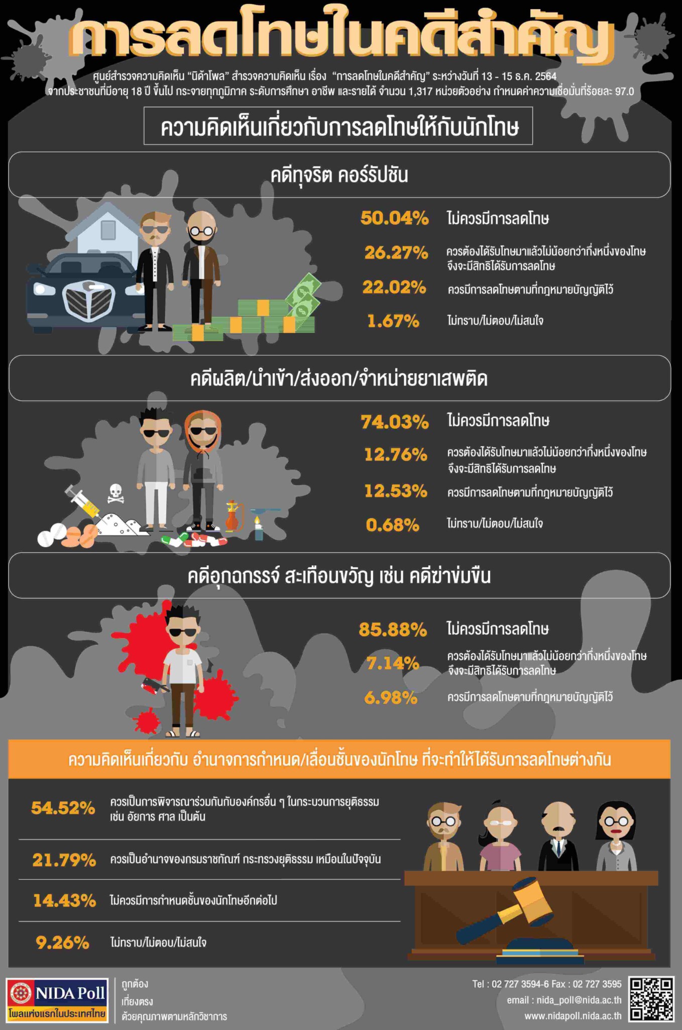 ศูนย์สำรวจความคิดเห็น “นิด้าโพล” สถาบันบัณฑิตพัฒนบริหารศาสตร์ (นิด้า) เปิดเผยผลสำรวจของประชาชน เรื่อง “การลดโทษในคดีสำคัญ” ทำการสำรวจระหว่าง วันที่ 13-15 ธันวาคม 2564 จากประชาชนที่มีอายุ 18 ปีขึ้นไป กระจายทุกภูมิภาค ระดับการศึกษา และอาชีพทั่วประเทศ รวมทั้งสิ้น จำนวน 1,317 หน่วยตัวอย่าง เกี่ยวกับการลดโทษในคดีสำคัญ การสำรวจอาศัยการสุ่มตัวอย่างโดยใช้ความน่าจะเป็นจากบัญชีรายชื่อฐานข้อมูลตัวอย่างหลัก (Master Sample) ของ “นิด้าโพล” สุ่มตัวอย่างด้วยวิธีแบบง่าย (Simple Random Sampling) เก็บข้อมูลด้วยวิธีการสัมภาษณ์ทางโทรศัพท์ โดยกำหนดค่าความเชื่อมั่นที่ร้อยละ 97.0