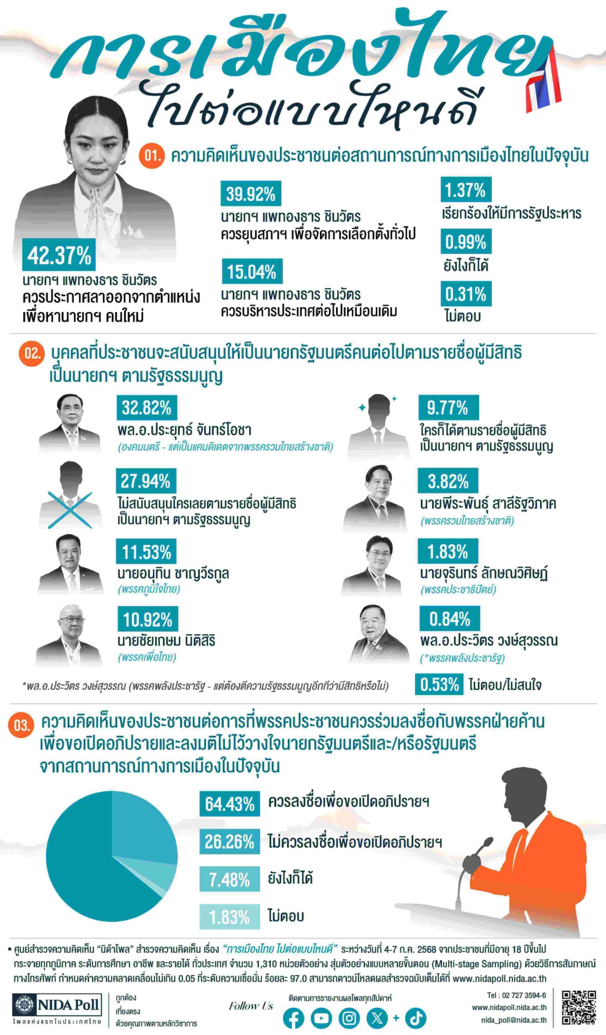 จากการสำรวจเมื่อถามความคิดเห็นของประชาชนต่อสถานการณ์ทางการเมืองไทยในปัจจุบัน พบว่า ตัวอย่าง ร้อยละ 42.37 ระบุว่า นายกรัฐมนตรีแพทองธาร ชินวัตร ควรประกาศลาออกจากตำแหน่ง เพื่อหานายกฯ คนใหม่ รองลงมา ร้อยละ 39.92 ระบุว่า นายกรัฐมนตรีแพทองธาร ชินวัตร ควรยุบสภาผู้แทนราษฎร เพื่อจัดการเลือกตั้งทั่วไป ร้อยละ 15.04 ระบุว่า นายกรัฐมนตรีแพทองธาร ชินวัตร ควรบริหารประเทศต่อไปเหมือนเดิม ร้อยละ 1.37 ระบุว่า เรียกร้องให้มีการรัฐประหาร ร้อยละ 0.99 ระบุว่า อย่างไรก็ได้ และร้อยละ 0.31 ระบุว่า ไม่ตอบ