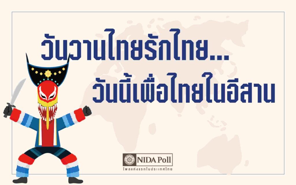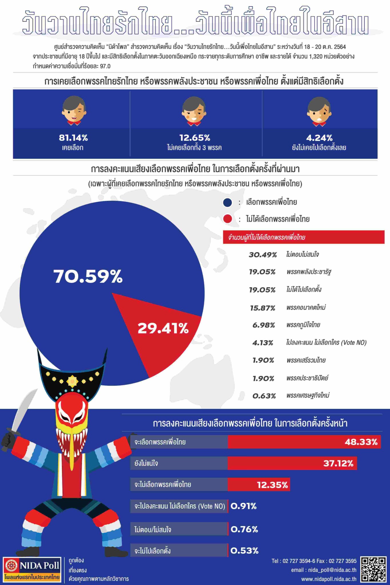 ศูนย์สำรวจความคิดเห็น “นิด้าโพล” สถาบันบัณฑิตพัฒนบริหารศาสตร์ (นิด้า) เปิดเผยผลสำรวจของประชาชน เรื่อง “วันวานไทยรักไทย…วันนี้เพื่อไทยในอีสาน” ทำการสำรวจระหว่างวันที่ 18-20 ตุลาคม 2564 จากประชาชนที่มีอายุ 18 ปีขึ้นไป และมีสิทธิเลือกตั้งในภาคตะวันออกเฉียงเหนือ กระจายทุกระดับการศึกษา อาชีพ และรายได้ รวมทั้งสิ้น จำนวน 1,320 หน่วยตัวอย่าง เกี่ยวกับวันวานไทยรักไทย…วันนี้เพื่อไทยในอีสาน การสำรวจอาศัยการสุ่มตัวอย่างโดยใช้ความน่าจะเป็นจากบัญชีรายชื่อฐานข้อมูลตัวอย่างหลัก (Master Sample) ของ “นิด้าโพล” สุ่มตัวอย่างด้วยวิธีแบบง่าย (Simple Random Sampling) เก็บข้อมูลด้วยวิธีการสัมภาษณ์ทางโทรศัพท์ โดยกำหนดค่าความเชื่อมั่นที่ร้อยละ 97.0