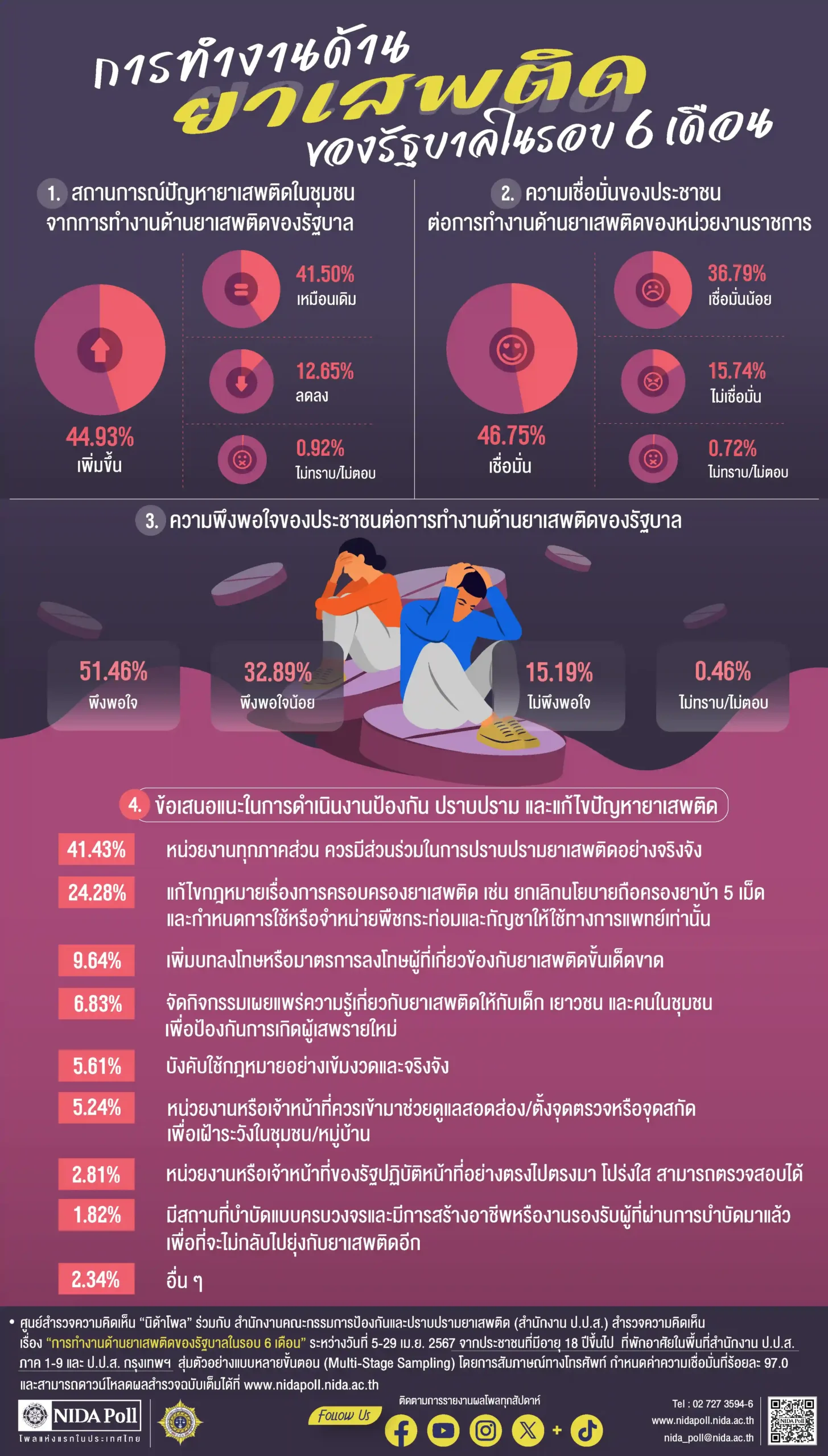 ศูนย์สำรวจความคิดเห็น “นิด้าโพล” สถาบันบัณฑิตพัฒนบริหารศาสตร์ (นิด้า) ร่วมกับสำนักงานคณะกรรมการป้องกันและปราบปราม ยาเสพติด (สำนักงาน ป.ป.ส.) เปิดเผยผลการสำรวจของประชุาชน เรื่อง “การทำงานด้านยาเสพติดของรัฐบาล ในรอบ 6 เดือน” ทำการสำรวจระหว่างวันที่ 5-29 เมษายน 2567 จากประชาชนที่มีอายุ 18 ปีขึ้นไป ที่พักอาศัยอยู่ในพื้นที่สำนักงาน ป.ป.ส. ภาค 1-9 และ สำนักงาน ป.ป.ส. กรุงเทพมหานคร เกี่ยวกับการทำงานด้านยาเสพติดของรัฐบาลในรอบ 6 เดือน การสำรวจอาศัยการสุ่มตัวอย่างโดยใช้ความน่าจะเป็นจากบัญชีรายชื่อฐานข้อมูลตัวอย่างหลัก (Master Sample) ของ “นิด้าโพล” สุ่มตัวอย่างแบบหลายขั้นตอน (Multi-stage Sampling) เก็บข้อมูลด้วยวิธีการสัมภาษณ์ทางโทรศัพท์ โดยกำหนดค่าความเชื่อมั่น ร้อยละ 97.0