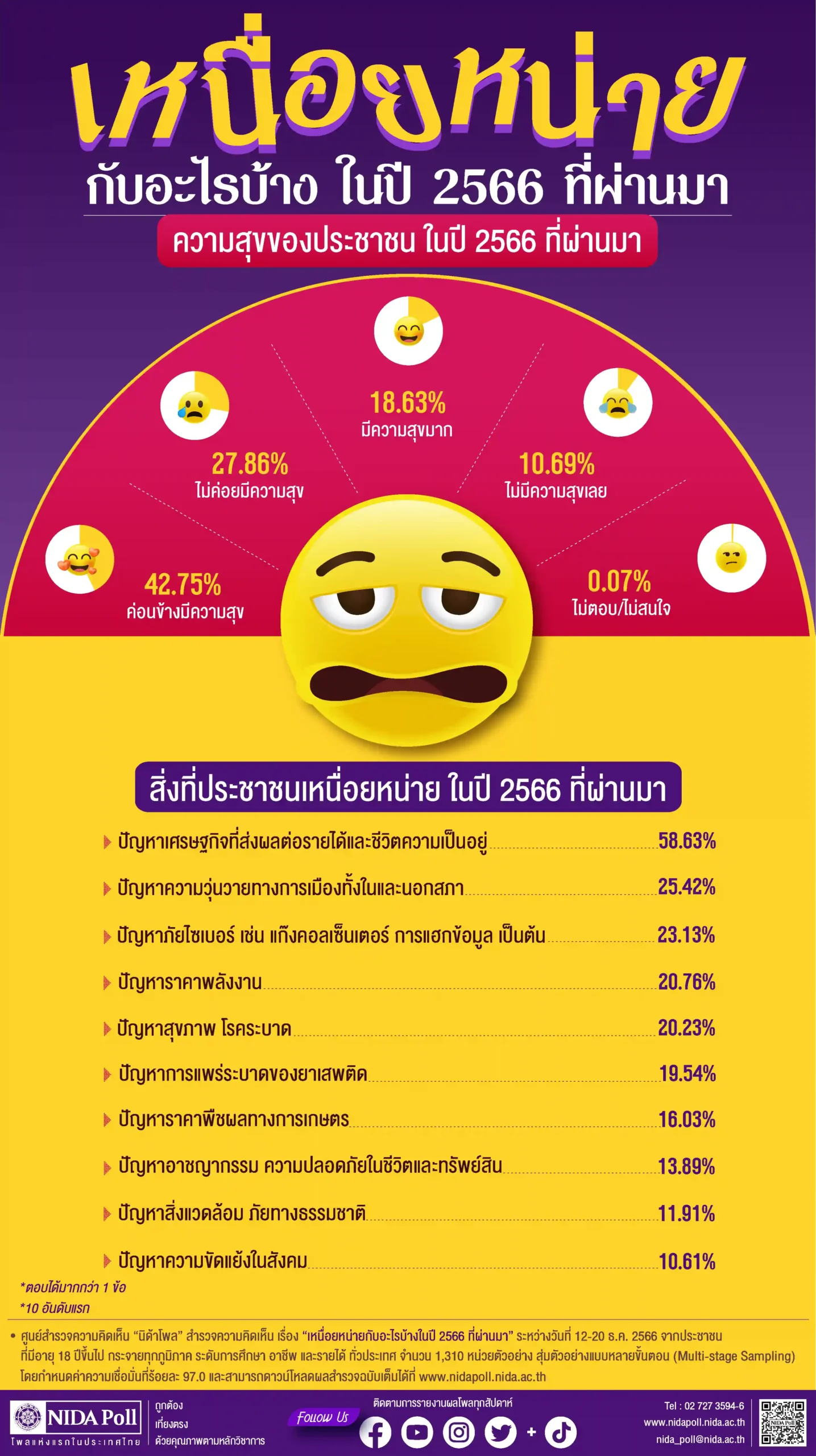ศูนย์สำรวจความคิดเห็น นิด้าโพล สถาบันบัณฑิตพัฒนบริหารศาสตร์ (นิด้า) เปิดเผยผลสำรวจของประชาชน เรื่อง เหนื่อยหน่ายกับอะไรบ้าง ในปี 2566 ที่ผ่านมา ทำการสำรวจระหว่างวันที่ 12-20 ธันวาคม 2566 จากประชาชนที่มีอายุ 18 ปีขึ้นไป กระจายทุกภูมิภาค ระดับการศึกษา อาชีพ และรายได้ ทั่วประเทศ รวมทั้งสิ้น จำนวน 1,310 หน่วยตัวอย่าง เกี่ยวกับความรู้สึกของประชาชนในปี 2566 ที่ผ่านมา การสำรวจอาศัยการสุ่มตัวอย่างโดยใช้ความน่าจะเป็นจากบัญชีรายชื่อฐานข้อมูลตัวอย่างหลัก (Master Sample) ของ นิด้าโพล สุ่มตัวอย่าง แบบหลายขั้นตอน (Multi-stage Sampling) เก็บข้อมูลด้วยวิธีการสัมภาษณ์ทางโทรศัพท์ โดยกำหนดค่าความเชื่อมั่น ร้อยละ 97.0