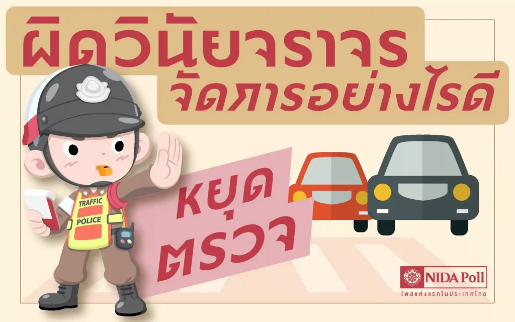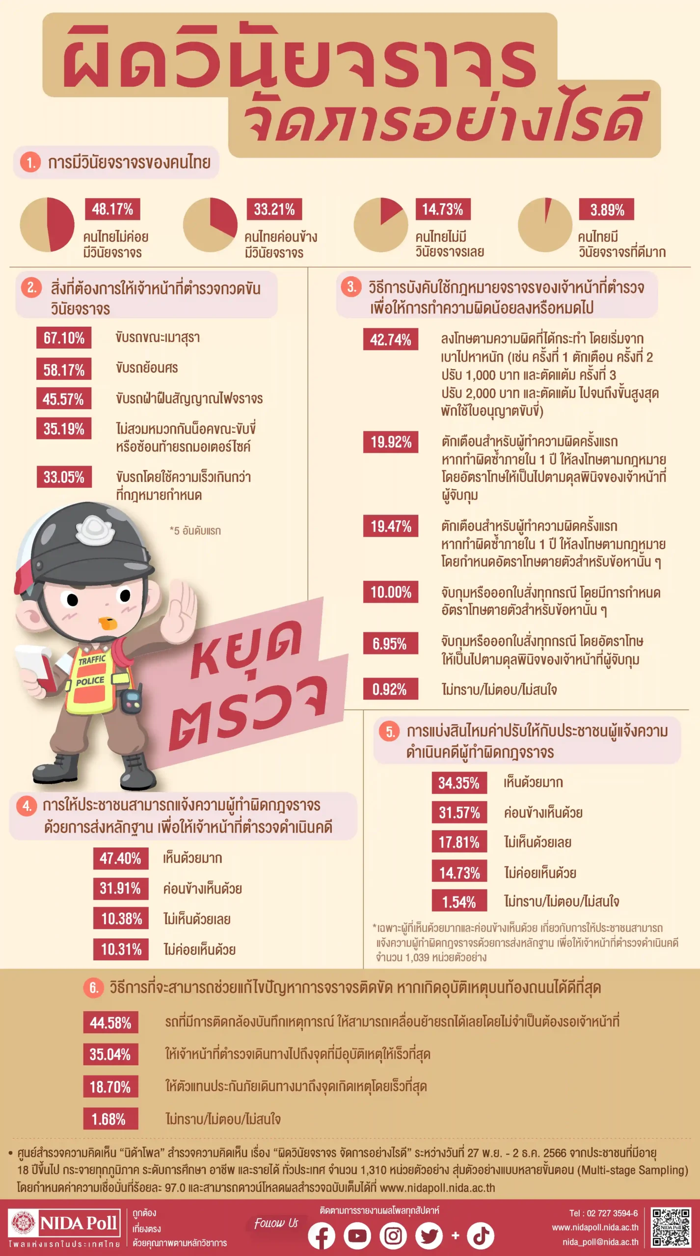 ศูนย์สำรวจความคิดเห็น นิด้าโพล สถาบันบัณฑิตพัฒนบริหารศาสตร์ (นิด้า) เปิดเผยผลสำรวจของประชาชน เรื่อง ผิดวินัยจราจร จัดการอย่างไรดี ทำการสำรวจระหว่างวันที่ 27 พฤศจิกายน ถึง 2 ธันวาคม 2566 จากประชาชนที่มีอายุ 18 ปีขึ้นไป กระจายทุกภูมิภาค ระดับการศึกษา อาชีพ และรายได้ ทั่วประเทศ รวมทั้งสิ้น จำนวน 1,310 หน่วยตัวอย่าง เกี่ยวกับวินัยจราจรของคนไทย การสำรวจอาศัยการสุ่มตัวอย่างโดยใช้ความน่าจะเป็นจากบัญชีรายชื่อฐานข้อมูลตัวอย่างหลัก (Master Sample) ของ นิด้าโพล สุ่มตัวอย่างแบบหลายขั้นตอน (Multi-stage Sampling) เก็บข้อมูลด้วยวิธีการสัมภาษณ์ทางโทรศัพท์ โดยกำหนดค่าความเชื่อมั่น ร้อยละ 97.0
