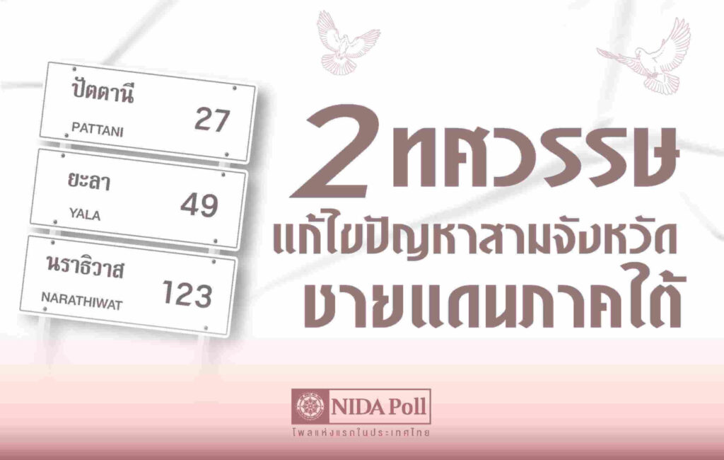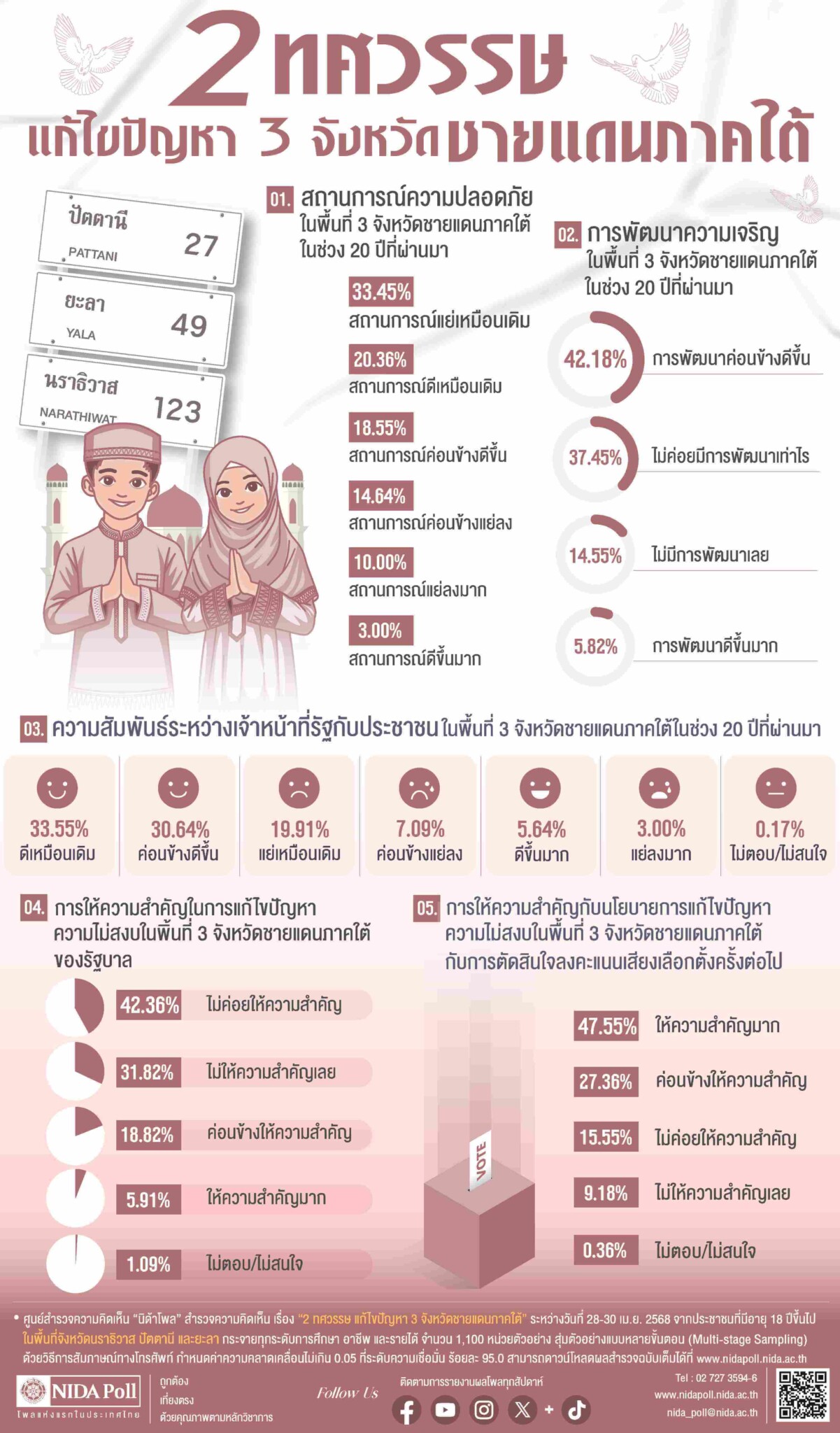 ศูนย์สำรวจความคิดเห็น “นิด้าโพล” สถาบันบัณฑิตพัฒนบริหารศาสตร์ (นิด้า) เปิดเผยผลการสำรวจ เรื่อง “2 ทศวรรษแก้ไขปัญหาสามจังหวัดชายแดนภาคใต้” ทำการสำรวจระหว่างวันที่ 28-30 เมษายน 2568 จากประชาชนที่มีอายุ 18 ปีขึ้นไป ในพื้นที่จังหวัดนราธิวาส ปัตตานี และยะลา กระจายทุกระดับการศึกษา อาชีพ และรายได้ รวมจำนวนทั้งสิ้น 1,100 หน่วยตัวอย่าง เกี่ยวกับสถานการณ์ความปลอดภัยในพื้นที่สามจังหวัดชายแดนภาคใต้ การสำรวจอาศัยการสุ่มตัวอย่างโดยใช้ความน่าจะเป็นจากบัญชีรายชื่อฐานข้อมูลตัวอย่างหลัก (Master Sample) ของ “นิด้าโพล” สุ่มตัวอย่างแบบหลายขั้นตอน (Multi-stage Sampling) เก็บข้อมูลด้วยวิธีการสัมภาษณ์ทางโทรศัพท์ โดยกำหนดค่าความคลาดเคลื่อนไม่เกิน 0.05 ที่ระดับความเชื่อมั่น ร้อยละ 95.0