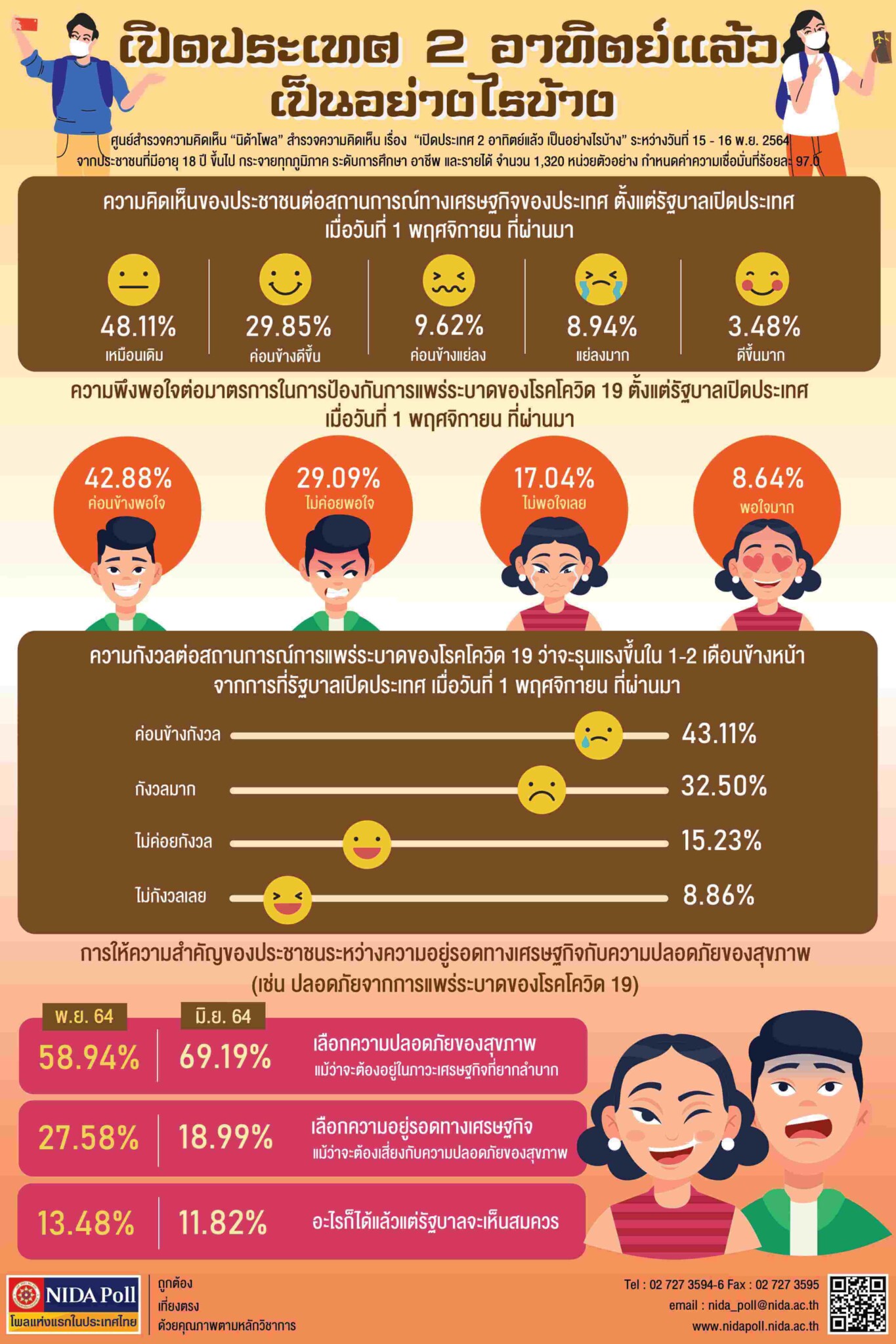 ศูนย์สำรวจความคิดเห็น “นิด้าโพล” สถาบันบัณฑิตพัฒนบริหารศาสตร์ (นิด้า) เปิดเผยผลสำรวจของประชาชน เรื่อง “เปิดประเทศ 2 อาทิตย์แล้วเป็นอย่างไรบ้าง” ทำการสำรวจระหว่าง วันที่ 15-16 พฤศจิกายน 2564 จากประชาชนที่มีอายุ 18 ปีขึ้นไป กระจายทุกภูมิภาคระดับการศึกษา และอาชีพทั่วประเทศ รวมทั้งสิ้น จำนวน 1,320 หน่วยตัวอย่าง เกี่ยวกับสถานการณ์ต่าง ๆ ของประเทศเป็นอย่างไร ตั้งแต่รัฐบาลเปิดประเทศ เมื่อวันที่ 1 พฤศจิกายน ที่ผ่านมา การสำรวจอาศัยการสุ่มตัวอย่างโดยใช้ความน่าจะเป็นจากบัญชีรายชื่อฐานข้อมูลตัวอย่างหลัก (Master Sample) ของ “นิด้าโพล” สุ่มตัวอย่างด้วยวิธีแบบง่าย (Simple Random Sampling) เก็บข้อมูลด้วยวิธีการสัมภาษณ์ทางโทรศัพท์ โดยกำหนดค่าความเชื่อมั่นที่ร้อยละ 97.0
